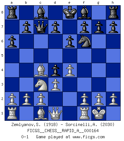 Last move : 0-1 2014 September 27 20:33:23 [Event "FICGS__CHESS__RAPID_A__000164"] [Site "FICGS"] [Date "2014.08.02"] [Round "1"] [White "Zemlyanov,Sergey"] [Black "Sorcinelli,Andrea"] [Result "0-1"] [WhiteElo "1918"] [BlackElo "2030"] 1.e4 c5 2.Nf3 Nc6 3.Nc3 Nf6 4.Bb5 Qc7 5.O-O Nd4 6.d3 a6 7.Bc4 e6 8.Nxd4 cxd4 0-1 This chess game has been lost on time (started : 2014.08.02 11:59:1) Sicilian defense Kingside Castling by player White (move 5) Player Black won this chess game. Follow this game move after move (download)Fischer, who may or may not be mad as a hatter, has every right to be horrified. (Jeremy Silman) Ich war schon mal beim Dopingtest. Da musste ich Urin abgeben, während Dritte zusahen. (Elisabeth Pähtz) Creo que una cierta cantidad de temperamento es esperada de los genios del Ajedrez. (Ron Gross) On entre au jeu d'Echecs comme on entre en Religion. Pour le joueur d'Echecs, la partie d'Echecs c'est l'office, la messe, le défilé du 1er Mai, le dépôt de gerbe au Monument aux Morts. C'est un drame sacré. (Michel Roos) Optimism is a variety of information deficit. Sometimes especially true for correspondence chess games. (Michael Aigner)