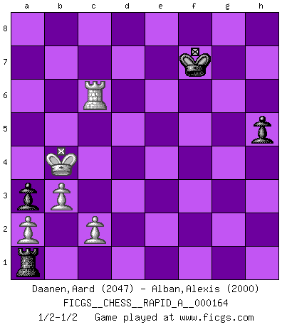 Last move : 1/2-1/2 2014 August 15 23:42:1 [Event "FICGS__CHESS__RAPID_A__000164"] [Site "FICGS"] [Date "2014.08.02"] [Round "1"] [White "Daanen,Aard"] [Black "Alban,Alexis"] [Result "1/2-1/2"] [WhiteElo "2047"] [BlackElo "2000"] 1.f4 d5 2.Nf3 g6 3.g3 Bg7 4.Bg2 Nf6 5.O-O O-O 6.d3 c5 7.Qe1 Nc6 8.e4 dxe4 9.dxe4 e5 10.Nc3 Nd4 11.Qd2 exf4 12.gxf4 Be6 13.e5 Nh5 14.Rd1 Nf5 15.Qf2 Qe7 16.Ng5 Rad8 17.Rxd8 Rxd8 18.Nxe6 fxe6 19.Bf3 Bh6 20.Bxh5 gxh5 21.Be3 b6 22.Ne4 Qb7 23.Qf3 Kh8 24.Kf2 Nxe3 25.Qxe3 Rd4 26.Kf3 Qf7 27.Rg1 Qf5 28.Rg2 a5 29.Rg3 a4 30.Rg2 b5 31.Rg3 b4 32.b3 a3 33.Rg2 Bxf4 34.Qxf4 Rxe4 35.Qxf5 exf5 36.e6 Rxe6 37.Kf4 Rg6 38.Rg5 Rd6 39.Rxf5 Rd2 40.Rxc5 Rxh2 41.Kg3 Rd2 42.Kh4 Kg7 43.Kxh5 Kf6 44.Kg4 Rd1 45.Rc4 Rc1 46.Kf4 h5 47.Rc6+ Ke7 48.Ke5 Kf7 49.Kd5 Rg1 50.Kc5 Ra1 51.Kxb4 1/2-1/2 Bird's Opening Kingside Castling by player White (move 5) Kingside Castling by player Black (move 5) 10 pieces endgame at move 43 : White KRPPP , Black KRPPP WHITE : King + 1 Rook 3 Pawns BLACK : King + 1 Rook 3 Pawns 9 pieces endgame at move 51 : White KRPPP , Black KRPP WHITE : King + 1 Rook 3 Pawns BLACK : King + 1 Rook 2 Pawns This chess game ended in a draw. Follow this game move after move (download)The boy (then a 12 year old boy named Anatoly Karpov) doesn't have a clue about Chess, and there's no future at all for him in this profession. (Mikhail Botvinnik) Bis jetzt ist Weiß einer wohlbekannten Analyse gefolgt. Aber jetzt begeht er einen schrecklichen Fehler: Er beginnt seinen eigenen Kopf zu benutzen. (Siegbert Tarrasch) Al jugar al Ajedrez entonces, podemos aprender: Primero: Previsión... Segundo: Prudencia... Tercero: Cautela... Y al final, aprendemos del Ajedrez el hábito de no ser desanimados por apariencias malas presentes en el estado de nuestros asuntos, el hábito de la esperanza por una oportunidad favorable y la perseveración de los secretos de los recursos. (Benjamin Franklin) Votre prénom est 'Tactique', votre deuxième prénom est 'Tactique' et votre nom est 'Tactique'. (Ken Smith) Everybody lies. (Gregory House, House M.D.)