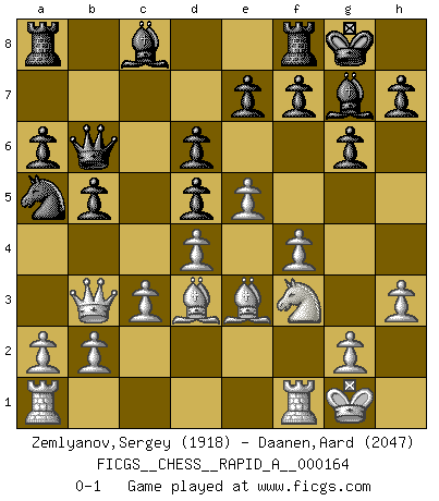 Last move : 0-1 2014 September 17 8:5:24 [Event "FICGS__CHESS__RAPID_A__000164"] [Site "FICGS"] [Date "2014.08.02"] [Round "1"] [White "Zemlyanov,Sergey"] [Black "Daanen,Aard"] [Result "0-1"] [WhiteElo "1918"] [BlackElo "2047"] 1.e4 d6 2.d4 Nf6 3.Nc3 g6 4.Be3 c6 5.h3 Bg7 6.f4 O-O 7.Nf3 b5 8.e5 Nd5 9.Nxd5 cxd5 10.c3 Qb6 11.Qb3 a6 12.Bd3 Nc6 13.O-O Na5 0-1 This chess game has been lost on time (started : 2014.08.02 11:59:1) Pirc defense Kingside Castling by player Black (move 6) Kingside Castling by player White (move 13) Player Black won this chess game. Follow this game move after move (download)It's always better to sacrifice your opponent's men. (Savielly Tartakover) Schach ist das schnellste Spiel der Welt, weil man in jeder Sekunde Tausende von Gedanken ordnen muß. (Albert Einstein) El Ajedrez es tortura mental. (Garry Kasparov) Des combinaisons [dans le jeu d'échecs] pareilles à des mélodies. Je crois entendre pour ainsi dire la musique des coups... (Vladimir Nabokov) Gambling : The sure way of getting nothing from something. (Wilson Mizner)