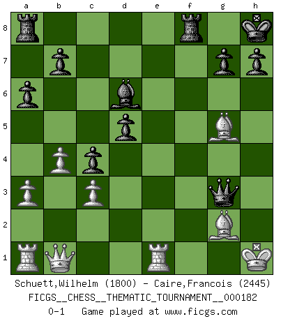 Last move : 0-1 2015 January 6 3:1:13 [Event "FICGS__CHESS__THEMATIC_TOURNAMENT__000182"] [Site "FICGS"] [Date "2014.08.05"] [Round "1"] [White "Schuett,Wilhelm"] [Black "Caire,Francois"] [Result "0-1"] [WhiteElo "1800"] [BlackElo "2445"] 1.e4 c5 2.Nf3 a6 3.c3 e6 4.d4 d5 5.e5 Nc6 6.Bd3 Qc7 7.a3 f6 8.exf6 Nxf6 9.O-O Bd6 10.Bg5 O-O 11.Nbd2 Kh8 12.b4 c4 13.Bc2 e5 14.dxe5 Nxe5 15.Qb1 Nxf3+ 16.Nxf3 Bg4 17.h3 Bxf3 18.gxf3 Qf7 19.Bf5 Nh5 20.Bg4 Nf4 21.Re1 Nxh3+ 22.Bxh3 Qxf3 23.Bg2 Qxf2+ 24.Kh1 Qg3 0-1 Sicilian : O'Kelly variation Kingside Castling by player White (move 9) Kingside Castling by player Black (move 10) Player Black won this chess game. Follow this game move after move (download)Chess is a fairy tale of 1001 blunders. (Savielly Tartakower) Wenn Du einsam bist, wenn Du Dich in der Welt wie ein Fremder fühlst, spiele Schach. Das wird Deinen Geist erheben und Dein Ratgeber im Kampf sein. (Aristoteles) El Ajedrez no es como la vida... ¡tiene reglas!. (Mark Pasternak) Mais n'est-ce pas déjà le limiter injurieusement que d'appeler les échecs un jeu? N'est-ce pas aussi une science, un art, ou quelque chose qui, comme le cercueil de Mahomet entre ciel et terre, est suspendu entre l'un et l'autre, et qui réunit un nombre incroyable de contraires ? (Stefan Zweig) I have opinions of my own - strong opinions - but I don't always agree with them. (George Bush)