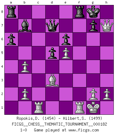 Last move : 1-0 2014 August 24 22:59:54 [Event "FICGS__CHESS__THEMATIC_TOURNAMENT__000182"] [Site "FICGS"] [Date "2014.08.05"] [Round "1"] [White "Ropokis,Dimitrios"] [Black "Hilbert,Stephan J."] [Result "1-0"] [WhiteElo "1454"] [BlackElo "1499"] 1.e4 c5 2.Nf3 a6 3.d4 cxd4 4.Nxd4 Nc6 5.Nc3 e6 6.f4 Nf6 7.e5 Nd5 8.Nxc6 bxc6 9.Qf3 Bb4 10.a3 Nxc3 11.axb4 Nd5 12.Bd2 O-O 13.c4 Ne7 14.Bd3 Bb7 15.O-O Qc7 16.Be3 d5 17.cxd5 cxd5 18.Bc5 Rfd8 19.Rac1 Qd7 20.Qh3 Ng6 21.f5 Nf8 22.Bxf8 Rxf8 23.fxe6 fxe6 24.Qxh7+ 1-0 Sicilian : O'Kelly variation Kingside Castling by player Black (move 12) Kingside Castling by player White (move 15) Player White won this chess game. Follow this game move after move (download)At this time Fischer is simply a level above all the best Chessplayers in the world. (John Jacobs) Dass jemand wie Surab Asmaiparaschwili, der selbst Elopunkte gekauft hat , Vize-Präsident der Fide werden konnte, sagt schon einges über den Zustand dieser Organisation aus. (Joel Lautier) Todos los Maestros de Ajedrez fueron un día unos principiantes. (Chernev) L'ordinateur a tué l'originalité. Il n'y a plus guère d'aventures sur l'échiquier. (Jacob Murray) Perhaps chess is the wrong game for the times (The Chess Master and the Computer, by Garry Kasparov - 2010)