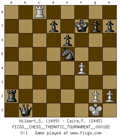 Last move : 0-1 2014 October 2 10:55:44 [Event "FICGS__CHESS__THEMATIC_TOURNAMENT__000182"] [Site "FICGS"] [Date "2014.08.05"] [Round "1"] [White "Hilbert,Stephan J."] [Black "Caire,Francois"] [Result "0-1"] [WhiteElo "1499"] [BlackElo "2445"] 1.e4 c5 2.Nf3 a6 3.b4 cxb4 4.a3 b5 5.c4 Bb7 6.axb4 bxc4 7.Bxc4 e6 8.b5 axb5 9.Rxa8 Bxa8 10.Bd3 Nf6 11.O-O Bxe4 12.Bxe4 Nxe4 13.d3 Nf6 14.Bg5 Nc6 15.Nc3 b4 16.Ne4 Be7 17.Nxf6+ Bxf6 18.Bf4 O-O 19.Qb3 Qa5 20.Bd6 Ra8 21.d4 Qa2 22.Qxa2 Rxa2 23.Ne5 Bxe5 24.Bxe5 b3 25.d5 Nxe5 26.dxe6 fxe6 27.Rc1 b2 28.Rc8+ Kf7 29.f4 b1Q+ 0-1 Sicilian : O'Kelly variation Kingside Castling by player White (move 11) Kingside Castling by player Black (move 18) Promotion Queen by player Black (move 29) Player Black won this chess game. Follow this game move after move (download)A sacrifice is best refuted by accepting it. (Wilhelm Steinitz) Kasparov stellt für gewöhnlich die Regeln auf und bricht sie dann selbst wieder. (Alexej Shirov) Después de la respuesta de las negras a 1.e4 con 1..e5, se quedan siempre tratando de entrar dentro del juego. (Howard Staunton) Dans le domaine de la peinture, de la gravure et de la sculpture, dès la première décennie de notre siècle, les artistes abandonnent la représentation de la partie d'échecs pour se concentrer sur les pièces, sur les échiquiers et sur toutes les variations auxquelles les unes et les autres peuvent donner lieu. On passe en quelque sorte d'un thème social à un thème musical (au sens de la musica médiévale, c'est-à-dire d'une notion qui inclue le rythme, l'harmonie, la construction et la déconstruction, etc.). Graphiquement et picturalement, l'échiquier apparaît comme une structure ouverte, dynamique, d'une richesse infinie, autorisant toutes les combinatoires et débouchant sur des mouvements et des rythmes de nature exponentielle. (Michel Pastoureau) Mac users swear by their computers. PC users swear at their computers. (Author unknown)