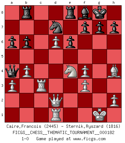 Last move : 1-0 2014 October 11 18:43:48 [Event "FICGS__CHESS__THEMATIC_TOURNAMENT__000182"] [Site "FICGS"] [Date "2014.08.05"] [Round "1"] [White "Caire,Francois"] [Black "Sternik,Ryszard"] [Result "1-0"] [WhiteElo "2445"] [BlackElo "1816"] 1.e4 c5 2.Nf3 a6 3.c4 e6 4.Nc3 Qc7 5.d4 cxd4 6.Nxd4 Nf6 7.a3 Nc6 8.Be3 Be7 9.Be2 O-O 10.O-O d6 11.Rc1 Nxd4 12.Qxd4 Nd7 13.Rfd1 Re8 14.b4 b6 15.Qd2 Rb8 16.Bg5 Bf8 17.f4 Qc6 18.Bh4 Bb7 19.Bf3 Qc7 20.e5 Bxf3 21.gxf3 Qxc4 22.Ne4 Qb3 23.Rc3 Qa4 24.exd6 1-0 Sicilian : O'Kelly variation Kingside Castling by player Black (move 9) Kingside Castling by player White (move 10) Player White won this chess game. Follow this game move after move (download)By this measure (on the gap between Fischer & his contemporaries), I consider him the greatest world champion. (Garry Kasparov) Mein Name ist Rustam Kamsky. Sie haben meinen Sohn belästigt. Bereiten Sie sich aufs Sterben vor. (Rustam Kamsky) Realmente no sabemos como el juego fue inventado, aunque hay sospechas. Tan pronto como descubramos a los culpables, se los haremos saber. (Bruce Pandolfini) En blitz, le Cavalier l'emporte sur le Fou. (Vlastimil Hort) History is the quarrels of popes and kings, with wars or pestilences in every page; the men all so good for nothing, and hardly any women at all. (Jane Austen)