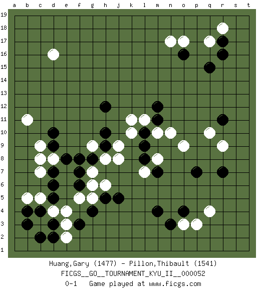 Last move : 0-1 2014 November 21 6:56:49 [Event "FICGS__GO__TOURNAMENT_KYU_II__000052"] [Site "FICGS"] [Date "2014.08.07"] [Round "1"] [Black "Huang,Gary"] [White "Pillon,Thibault"] [Result "0-1"] [Rating 1 "1477"] [Rating 2 "1541"] 1.q15 d4 2.d6 d16 3.f3 q4 4.c4 q17 5.r17 r18 6.r16 n17 7.r11 r9 8.o16 o17 9.r7 q10 10.p7 o9 11.o4 o3 12.n3 p3 13.m4 c3 14.d3 c5 15.b4 e3 16.d2 b5 17.d5 e4 18.b3 e2 19.c2 c7 20.d7 c8 21.g4 f5 22.f7 g5 23.h5 h6 24.j5 d8 25.e8 g7 26.g8 h8 27.d9 c9 28.d10 b11 29.h9 g9 30.f8 j9 31.h10 j8 32.f6 g6 33.l9 k10 34.l10 k11 35.h12 l11 36.m11 m8 37.l8 m10 38.m7 n10 39.m12 l7 0-1 Here are the names of the openings (joseki) played in the four corners : Corner d4 : d4 d6 Hoshi (Hwajeom, Seongjeom, Xingwei`) 4-4 Point. The star or hoshi (4-4) point, emphasizing influence at the potential expense of territory. Ikken Takagakari (Hankan Nop'dakeolch'im, Yi Gaojia, 1-Space High Approach). White typically responds at 6-4 or 3-10. White 4-10 is played when White finds play on the right side advantageous. White 4-8 or 3-8 may be played when White has support at top. Corner q16 : q15 q17 Takamoku (Gomok, Gaomu`) 5-4 Point. The takamoku (high) point (5-4). With its emphasis on influence, the 5-4 point complements the 4-4 (hoshi) point in creating an influence-oriented fuseki. Komoku. Black responds with 3-3, 3-5, 4-6, 4-7, 3-6, 3-7. Player White won this Go (weiqi, baduk) game. Follow this game move after move (download)Balance is not what players strike for, and if it does arise, it is in spite of them. (Pierre Audouard) In God we trust, all others we virus scan. (Anonymous)