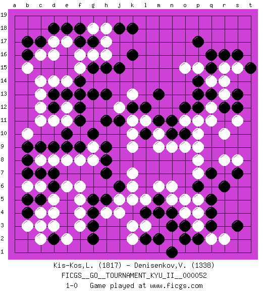 Last move : 1-0 2014 October 24 21:10:8 [Event "FICGS__GO__TOURNAMENT_KYU_II__000052"] [Site "FICGS"] [Date "2014.08.07"] [Round "1"] [Black "Kis-Kos,Laszlo"] [White "Denisenkov,Valentin"] [Result "1-0"] [Rating 1 "1817"] [Rating 2 "1338"] 1.r16 c4 2.q3 d16 3.p17 r10 4.r6 r13 5.e4 h4 6.d6 c6 7.c7 d5 8.e5 e6 9.d7 f6 10.c3 b3 11.b5 b6 12.c5 d4 13.b4 d3 14.e3 c2 15.d2 c3 16.b7 e2 17.g5 f5 18.g4 f4 19.g3 f3 20.g2 l3 21.n3 l5 22.h5 j5 23.h7 k7 24.f17 c14 25.k16 c11 26.h9 n5 27.p6 p5 28.q5 o4 29.o3 p3 30.p2 p4 31.q4 q2 32.o2 r2 33.l2 k2 34.m2 k3 35.n1 j4 36.n4 o5 37.m5 m6 38.m4 n6 39.s3 f8 40.d9 f10 41.d18 k9 42.h11 k11 43.h13 k13 44.f11 e11 45.f12 f15 46.h15 p9 47.c17 c16 48.p13 q12 49.m13 o11 50.l12 l11 51.k12 j12 52.j11 s15 53.s16 r15 54.q15 q14 55.p14 g16 56.g17 h16 57.j15 h17 58.k18 g18 59.f18 h18 60.b16 b15 61.b17 e17 62.e18 f16 63.e10 d11 64.f9 g9 65.g10 g8 66.h8 e8 67.e9 d8 68.c9 c8 69.b8 b10 70.b9 s8 71.m11 m10 72.p12 p11 73.q13 r14 74.r12 q11 75.s12 s11 76.s13 p7 77.q7 p8 78.l10 k10 79.n10 m9 80.n11 n9 81.o10 o9 82.o12 p10 83.l4 k5 84.d13 c13 85.d12 e12 86.e13 f13 87.f14 e14 88.g13 d14 89.s7 r8 90.g15 d17 91.j6 k6 92.j18 c12 93.f13 p15 94.q16 o15 95.t15 1-0 Here are the names of the openings (joseki) played in the four corners : Corner d4 : c4 e4 Komoku (Somok, Xiao~mu`) 3-4 Point. The komoku (3-4) point is the traditional corner enclosure move.. Ikken Takagakari (Hankan Nop'dakeolch'im, Yi Gaogua`jiao~, 1-Space High Approach). The 5-4 approach move has become more popular in modern times, as modern Go emphasizes speed and influence. Corner d16 : d16 f17 Hoshi (Hwajeom, Seongjeom, Xingwei`) 4-4 Point. The star or hoshi (4-4) point, emphasizing influence at the potential expense of territory. Ikken Kakari (Hankan Keolch'im, Yi Gua`jiao~, 1-Space Low Approach). Black 2 is the standard approach move to the 4-4. Player Black won this Go (weiqi, baduk) game. Follow this game move after move (download)Add one stone, then sacrifice both. (Anonymous) Those who make the worst use of their time are the first to complain of its brevity. (Jean de la Bruyere)