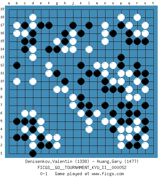 Last move : 0-1 2015 February 17 7:38:18 [Event "FICGS__GO__TOURNAMENT_KYU_II__000052"] [Site "FICGS"] [Date "2014.08.07"] [Round "1"] [Black "Denisenkov,Valentin"] [White "Huang,Gary"] [Result "0-1"] [Rating 1 "1338"] [Rating 2 "1477"] 1.q16 q17 2.r17 r16 3.r15 s16 4.q15 r18 5.s15 s17 6.q10 q4 7.d4 c4 8.c3 d3 9.b3 e4 10.d5 e5 11.e3 d2 12.e2 d6 13.c5 c6 14.b5 f3 15.f2 g3 16.d16 g2 17.d1 d14 18.f17 d10 19.r6 p6 20.s4 r8 21.q7 q8 22.p7 r10 23.r11 q11 24.r12 p10 25.s10 q9 26.r3 q3 27.k16 l4 28.o6 o5 29.p5 p4 30.q5 n5 31.n7 c16 32.c17 b17 33.c15 b16 34.d15 d17 35.e17 d18 36.c14 d13 37.b12 b10 38.f14 n17 39.l17 f12 40.p13 s9 41.s11 h14 42.h15 n15 43.o9 n11 44.o11 o10 45.n9 g15 46.g14 j15 47.h16 j16 48.j17 j14 49.k8 j7 50.k7 k6 51.k10 h9 52.k12 r5 53.q6 r4 54.s5 s3 55.r2 s2 56.q2 p2 57.o4 p3 58.l6 l5 59.n10 o12 60.m11 n12 61.p12 p11 62.s7 m12 63.l11 l14 64.o16 n16 65.p17 p18 66.p9 m6 67.l7 j8 68.g11 f11 69.h10 g9 0-1 This go game has been lost on time (started : 2014.08.07 15:26:3) Here are the names of the openings (joseki) played in the four corners : Corner q16 : q16 q17 Hoshi (Hwajeom, Seongjeom, Xingwei`) 4-4 Point. The star or hoshi (4-4) point, emphasizing influence at the potential expense of territory. Corner d4 : d4 c4 Hoshi (Hwajeom, Seongjeom, Xingwei`) 4-4 Point. The star or hoshi (4-4) point, emphasizing influence at the potential expense of territory. Corner d16 : d16 d14 Hoshi (Hwajeom, Seongjeom, Xingwei`) 4-4 Point. The star or hoshi (4-4) point, emphasizing influence at the potential expense of territory. Ikken Takagakari (Hankan Nop'dakeolch'im, Yi Gaojia, 1-Space High Approach). Black typically responds at 6-4 or 3-10. Black 4-10 is played when Black finds play on the right side advantageous. Black 4-8 or 3-8 may be played when Black has support at top. Corner q4 : q4 r6 Hoshi (Hwajeom, Seongjeom, Xingwei`) 4-4 Point. The star or hoshi (4-4) point, emphasizing influence at the potential expense of territory. Ikken Kakari (Hankan Keolch'im, Yi Gua`jiao~, 1-Space Low Approach). Black 2 is the standard approach move to the 4-4. Player White won this Go (weiqi, baduk) game. Follow this game move after move (download)Against three in a row, play right in the center. (Anonymous) You can think I'm wrong, but that's no reason to quit thinking. (Gregory House, House M.D.)