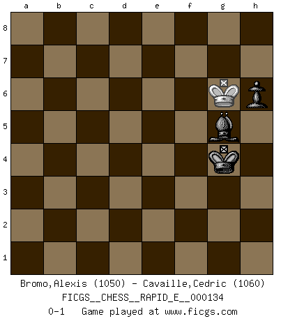 Last move : 0-1 2014 September 13 10:38:32 [Event "FICGS__CHESS__RAPID_E__000134"] [Site "FICGS"] [Date "2014.08.09"] [Round "1"] [White "Bromo,Alexis"] [Black "Cavaille,Cedric"] [Result "0-1"] [WhiteElo "1050"] [BlackElo "1060"] 1.d4 d5 2.c4 dxc4 3.Nc3 e6 4.a3 Bd7 5.Nf3 Nf6 6.Bg5 h6 7.Bh4 Be7 8.Bxf6 Bxf6 9.e3 b5 10.Be2 a6 11.h3 Bc6 12.O-O O-O 13.b4 Bxf3 14.Bxf3 c6 15.Re1 a5 16.Nxb5 axb4 17.axb4 Rxa1 18.Qxa1 cxb5 19.Rc1 Nd7 20.Bc6 Nb6 21.Bxb5 Qc7 22.Qa2 Rc8 23.Qe2 Be7 24.Qe1 Bd8 25.e4 Qd6 26.d5 Bc7 27.g3 exd5 28.exd5 Qxd5 29.Be8 Nd7 30.Bxd7 Qxd7 31.Rxc4 Bb6 32.Rxc8+ Qxc8 33.b5 Qc5 34.Qe2 Kf8 35.Kg2 f6 36.h4 Kf7 37.h5 Qe5 38.Qc4+ Ke7 39.g4 Qe6 40.Qxe6+ Kxe6 41.Kf3 Kd5 42.Ke2 Kc4 43.f3 Kxb5 44.Kd3 Kc6 45.Ke4 Bc5 46.Kf5 Kd5 47.Kg6 Be3 48.Kxg7 Bg5 49.f4 Bxf4 50.Kxf6 Bg5+ 51.Kf5 Kd4 52.Kg6 Ke4 53.Kf7 Kf3 54.Ke6 Kxg4 55.Ke5 Kxh5 56.Kf5 Kh4 57.Kg6 Kg4 0-1 Queen's gambit accepted Kingside Castling by player White (move 12) Kingside Castling by player Black (move 12) 10 pieces endgame at move 40 : White KPPPP , Black KBPPP WHITE : King + 4 Pawns BLACK : King + 1 Bishop 3 Pawns 9 pieces endgame at move 43 : White KPPP , Black KBPPP WHITE : King + 3 Pawns BLACK : King + 1 Bishop 3 Pawns 8 pieces endgame at move 48 : White KPPP , Black KBPP WHITE : King + 3 Pawns BLACK : King + 1 Bishop 2 Pawns 7 pieces endgame at move 49 : White KPP , Black KBPP WHITE : King + 2 Pawns BLACK : King + 1 Bishop 2 Pawns 6 pieces endgame at move 50 : White KPP , Black KBP WHITE : King + 2 Pawns BLACK : King + 1 Bishop 1 Pawn 5 pieces endgame at move 54 : White KP , Black KBP WHITE : King + 1 Pawn BLACK : King + 1 Bishop 1 Pawn 4 pieces endgame at move 55 : White K , Black KBP WHITE : King + BLACK : King + 1 Bishop 1 Pawn Player Black won this chess game. Follow this game move after move (download)Different people feel differently about resigning. (Bobby Fischer) Als er Schachweltmeister wurde ließ er praktisch alle stärksten Sovietspieler für sich arbeiten. Wenn ein auch nur mittelmässiger Meister ein Spezialist für eine bestimmte Eröffnung war, wurde er von Karpov gerufen. Das wurde alles geheim gehalten. (Mikhail Moiseyevich Botvinik) Las combinaciones han sido siempre el aspecto más intrigante del Ajedrez. Los Maestros las buscan, el público las aplauden, los críticos las alaban. La razón se debe a que las combinaciones hacen posible que el Ajedrez sea más que un ejercicio matemático con una carencia de vida. Ellas son la poesía del juego, son del Ajedrez lo que la melodía es de la música. Ellas representan el triunfo de la mente sobre la materia. (Reuben Fine) Le moment que je préfère le plus dans une rencontre, c'est celui où je sens que la personnalité de l'adversaire se brise. (Robert Fischer) Just because you do not take an interest in politics doesn't mean politics won't take an interest in you. (Pericles 430 B.C.)