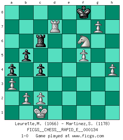 Last move : 1-0 2014 October 17 19:26:20 [Event "FICGS__CHESS__RAPID_E__000134"] [Site "FICGS"] [Date "2014.08.09"] [Round "1"] [White "Leurette,Marc-Antoine"] [Black "Martinez,Silvio"] [Result "1-0"] [WhiteElo "1066"] [BlackElo "1178"] 1.e4 Nc6 2.d4 e6 3.Nf3 d6 4.Nc3 Nf6 5.Bb5 Bd7 6.Bg5 Be7 7.Qd3 O-O 8.O-O-O a6 9.Bxc6 Bxc6 10.d5 exd5 11.exd5 Nxd5 12.Bxe7 Qxe7 13.Nxd5 Bxd5 14.Qxd5 c6 15.Rhe1 Qf6 16.Qxd6 Qxd6 17.Rxd6 h5 18.h4 Rac8 19.Ng5 b5 20.f4 f6 21.Ne6 Rfe8 22.f5 a5 23.Red1 Kf7 24.Rd7+ Re7 25.Nxg7 Rxd7 26.Rxd7+ Kf8 27.Nxh5 Ke8 28.Nxf6+ Kf8 29.g4 a4 30.a3 c5 31.g5 c4 32.g6 Rc6 33.g7+ 1-0 KP : Nimzovich defense Kingside Castling by player Black (move 7) Queenside Castling by player White (move 8) Player White won this chess game. Follow this game move after move (download)We like to think. (Gary Kasparov) Schach ist das schnellste Spiel der Welt, weil man in jeder Sekunde Tausende von Gedanken ordnen muß. (Albert Einstein) El Ajedrez, como cualquier otra actividad creativa, puede existir solo a través de méritos combinados de aquellos que tienen talento creativo y de aquellos que tienen la habilidad de organizar un trabajo creativo. (Mikhail Botvinnik) C'est une question de caractère, Beaucoup de gens perdent leur motivation très vite. D'autres, ils sont rares, peuvent la conserver très longtemps. J'aime les échecs, encore aujourd'hui je suis heureux d'analyser des parties. J'aime toujours gagner, je déteste encore perdre. Bien jouer est important pour mon intégrité intellectuelle et morale. Et puis les échecs vivent en ce moment une période historique grâce à Internet. Ils se développent dans les systèmes éducatifs à travers le monde. Ils sortent de leur ghetto, et c'est mon rôle de mener à bien cette révolution. (Gary Kasparov) The human is the only animal species whose members are able to talk themselves into difficulties that would not otherwise exist. (Wendell Johnson)