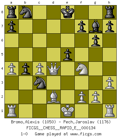 Last move : 1-0 2014 October 7 21:25:0 [Event "FICGS__CHESS__RAPID_E__000134"] [Site "FICGS"] [Date "2014.08.09"] [Round "1"] [White "Bromo,Alexis"] [Black "Pech,Jaroslav"] [Result "1-0"] [WhiteElo "1050"] [BlackElo "1176"] 1.d4 d5 2.c4 c6 3.Nc3 Nf6 4.Nf3 dxc4 5.e4 b5 6.a4 b4 7.Ne2 Nxe4 8.h3 g6 9.Nf4 Ba6 10.b3 c5 11.Bxc4 Bxc4 12.bxc4 Nc3 13.Qd3 cxd4 14.Nxd4 Bg7 15.Be3 e5 16.Bd2 Qxd4 17.Qxd4 1-0 This chess game has been lost on time (started : 2014.08.09 4:14:47) QGD Slav defense Player White won this chess game. Follow this game move after move (download)I prefer to lose a really good game than to win a bad one. (David Levy) Charakterschwächen offenbaren sich normalerweise während einer Schachpartie. (Garry Kasparov) Cuando tu casa esta en llamas, no puedes ser molestado por tus vecinos. O, como decinos en Ajedrez, si tu Rey esta bajo ataque, no te preocupa perder un Peón del lado de la Reina. (Gary Kasparov) Shah mat. Le roi est mort. Cri de fierté d'un joueur venant de terrasser son adversaire, courtoisement, sans effusion de sang. Good luck. You're gonna need it. (Han Solo in Star Wars ep.6)