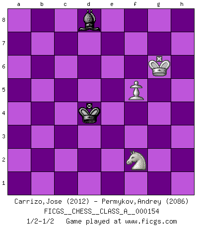 Last move : 1/2-1/2 2015 January 14 7:57:50 [Event "FICGS__CHESS__CLASS_A__000154"] [Site "FICGS"] [Date "2014.08.10"] [Round "1"] [White "Carrizo,Jose"] [Black "Permykov,Andrey"] [Result "1/2-1/2"] [WhiteElo "2012"] [BlackElo "2086"] 1.e4 c5 2.Nf3 d6 3.d4 cxd4 4.Nxd4 Nf6 5.Nc3 a6 6.Be3 e5 7.Nb3 Be7 8.f3 Be6 9.Qd2 O-O 10.O-O-O Nbd7 11.g4 b5 12.g5 Nh5 13.Nd5 Bxd5 14.exd5 f6 15.gxf6 Bxf6 16.Na5 Nf4 17.Nc6 Qc7 18.Kb1 Nb6 19.Bd3 Nbxd5 20.Bxf4 Nxf4 21.Be4 d5 22.Bxd5+ Nxd5 23.Qxd5+ Kh8 24.Qe4 Rac8 25.Nb4 Qa7 26.b3 a5 27.Nd5 a4 28.Rhe1 axb3 29.cxb3 Rcd8 30.h4 Qf7 31.Nc3 Rxd1+ 32.Rxd1 Be7 33.Rd3 Qh5 34.Rd5 Qxh4 35.Qxh4 Bxh4 36.Rxb5 h5 37.Rxe5 g6 38.Ne4 Bd8 39.Rd5 h4 40.Rd3 Be7 41.Kc1 Kg7 42.Kd1 h3 43.Rd7 Kf7 44.Rd2 Rd8 45.Rxd8 Bxd8 46.Ke2 h2 47.Nf2 Bb6 48.Nh1 Ke6 49.Kf1 Kd5 50.Kg2 Kc5 51.Kxh2 Kb4 52.Kg3 Ka3 53.Kf4 Kxa2 54.Kg5 Kxb3 55.Kxg6 Bd8 56.f4 Kc4 57.Nf2 Kd4 58.f5 1/2-1/2 Sicilian : Najdorf, Byrne (English) attack Kingside Castling by player Black (move 9) Queenside Castling by player White (move 10) 10 pieces endgame at move 45 : White KRNPPP , Black KBPP WHITE : King + 1 Rook 1 Knight 3 Pawns BLACK : King + 1 Bishop 2 Pawns 9 pieces endgame at move 45 : White KNPPP , Black KBPP WHITE : King + 1 Knight 3 Pawns BLACK : King + 1 Bishop 2 Pawns 8 pieces endgame at move 51 : White KNPPP , Black KBP WHITE : King + 1 Knight 3 Pawns BLACK : King + 1 Bishop 1 Pawn 7 pieces endgame at move 53 : White KNPP , Black KBP WHITE : King + 1 Knight 2 Pawns BLACK : King + 1 Bishop 1 Pawn 6 pieces endgame at move 54 : White KNP , Black KBP WHITE : King + 1 Knight 1 Pawn BLACK : King + 1 Bishop 1 Pawn 5 pieces endgame at move 55 : White KNP , Black KB WHITE : King + 1 Knight 1 Pawn BLACK : King + 1 Bishop This chess game ended in a draw. Follow this game move after move (download)Don't even mention losing to me. I can't stand to think of it. (Bobby Fischer) Smyslow ist ein Beweis dafür, dass ich noch zehn Jahre spielen kann! [der 75 jährige über den 85 jährigen] (Viktor Kortschnoi) Fischer deseaba darle a los Rusos una sopa de su propia medicina. (Larry Evans) Le génie consiste à savoir transgresser les règles au moment opportun. (Teichmann) I've lost money so fast in these clubs it's left me reeling. I've read every poker book ever written, but the only way to get better at the game is to go out and play with people who are really good. The problem is, you stand to lose a lot of money doing it. (Matt Damon)