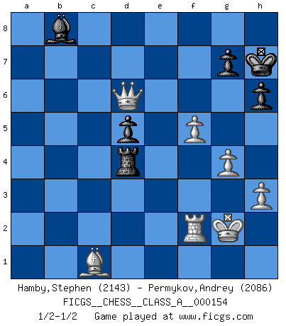 Last move : 1/2-1/2 2015 March 4 10:32:42 [Event "FICGS__CHESS__CLASS_A__000154"] [Site "FICGS"] [Date "2014.08.10"] [Round "1"] [White "Hamby,Stephen"] [Black "Permykov,Andrey"] [Result "1/2-1/2"] [WhiteElo "2143"] [BlackElo "2086"] 1.c4 e5 2.g3 Nf6 3.Bg2 Nc6 4.Nc3 Bc5 5.e3 d6 6.Nge2 a6 7.O-O O-O 8.d4 exd4 9.exd4 Ba7 10.h3 h6 11.b3 Re8 12.Bb2 Bf5 13.Qd2 Qd7 14.g4 Be4 15.Nxe4 Nxe4 16.Qc2 d5 17.Rad1 Nf6 18.c5 Nd8 19.Nf4 c6 20.Nd3 Qc7 21.f4 b6 22.Kh1 Ne6 23.Rde1 a5 24.a3 Reb8 25.b4 Rb7 26.Kg1 axb4 27.axb4 Bb8 28.Rf2 Ra2 29.Qb1 Ra4 30.Re3 Qd8 31.Qe1 bxc5 32.Rxe6 fxe6 33.Nxc5 Raxb4 34.Nxb7 Rxb7 35.Qxe6+ Kh8 36.Qxc6 Re7 37.Rf1 Ne4 38.Ba3 Re8 39.Kh2 Nd2 40.Rf2 Ne4 41.Bxe4 Rxe4 42.Bc1 Kh7 43.Kg2 Rxd4 44.f5 Qd6 45.Qxd6 1/2-1/2 English Opening Kingside Castling by player White (move 7) Kingside Castling by player Black (move 7) This chess game ended in a draw. Follow this game move after move (download)You can only get good at Chess if you love the game. (Bobby Fischer) Schach ist ein Reich, wo sich die menschliche Phantasie frei entfalten kann. (David Bronstein) El Ajedrez, como la música, como el amor, tiene el poder de hacer feliz a la gente. (Siegbert Tarrasch) Les échecs sont un jeu terrible. Si vous n'avez pas le centre, votre adversaire a une position plus libre. Par contre, si vous avez le centre, alors vous avez vraiment quelque chose pour laquelle vous inquiéter ! (Siegbert Tarrasch) Yoga is 99% practice and 1% knowledge. (Sri Krishna Pattabhi Jois)