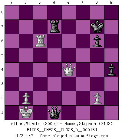 Last move : 1/2-1/2 2015 April 16 20:16:39 [Event "FICGS__CHESS__CLASS_A__000154"] [Site "FICGS"] [Date "2014.08.10"] [Round "1"] [White "Alban,Alexis"] [Black "Hamby,Stephen"] [Result "1/2-1/2"] [WhiteElo "2000"] [BlackElo "2143"] 1.d4 Nf6 2.c4 g6 3.Nc3 Bg7 4.e4 d6 5.Nf3 O-O 6.Be2 e5 7.d5 Nbd7 8.Be3 Ng4 9.Bg5 f6 10.Bc1 a5 11.h3 Nh6 12.Be3 Nc5 13.h4 f5 14.Bxc5 dxc5 15.Qc2 Qe7 16.O-O-O Ng4 17.Rdf1 Bh6+ 18.Kb1 Nf6 19.Nd2 Ra6 20.Bd3 Bd7 21.Rfg1 Bxd2 22.Qxd2 fxe4 23.Bxe4 Nxe4 24.Nxe4 a4 25.a3 Rf4 26.Re1 Bf5 27.f3 h5 28.Ka2 Kg7 29.Re2 Bxe4 30.Rxe4 Rxe4 31.fxe4 Ra8 32.Qd1 Rf8 33.Qxa4 Rf4 34.Qa8 Rxe4 35.Rc1 Rxh4 36.Qxb7 Rd4 37.Qb3 Qg5 38.Qc3 Qf6 39.Re1 h4 40.a4 c6 41.a5 cxd5 42.cxd5 Rxd5 43.Kb1 Qf5+ 44.Ka2 Qg4 45.Kb1 Qa4 46.Rf1 Qe4+ 47.Qc2 Qd4 48.Rc1 e4 49.a6 Rd7 50.Qxc5 Qd3+ 51.Qc2 Qxa6 52.Qxe4 Qd6 53.Rc6 Qd1+ 1/2-1/2 King's Indian : Petrosian system, Main line Kingside Castling by player Black (move 5) Queenside Castling by player White (move 16) 10 pieces endgame at move 52 : White KQRPP , Black KQRPP WHITE : King + 1 Queen 1 Rook 2 Pawns BLACK : King + 1 Queen 1 Rook 2 Pawns This chess game ended in a draw. Follow this game move after move (download)Excellence at Chess is one mark of a scheming mind. (Sir Arthur Conan Doyle) Jeder Fehler erscheint unglaublich dumm, wenn andre ihn begehen. (Georg Christoph Lichtenberg) Un mal día en el Ajedrez, es mejor que cualquier buen día en el trabajo. (Anonymous) Tous ces prétendus hommes politiques sont les pions, les Cavaliers, les Tours ou les Fous d'une partie d'échecs qui se jouera tant qu'un hasard ne renversera pas l'échiquier. (Honoré de Balzac) There are more things in heaven and earth than practically anywhere else. (Unknown)