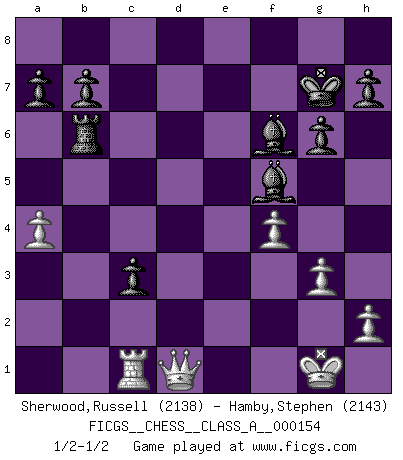 Last move : 1/2-1/2 2015 February 3 12:15:9 [Event "FICGS__CHESS__CLASS_A__000154"] [Site "FICGS"] [Date "2014.08.10"] [Round "1"] [White "Sherwood,Russell"] [Black "Hamby,Stephen"] [Result "1/2-1/2"] [WhiteElo "2138"] [BlackElo "2143"] 1.e4 e6 2.d4 d5 3.e5 c5 4.c3 Nc6 5.Nf3 Qb6 6.a3 f6 7.Bd3 fxe5 8.dxe5 c4 9.Bc2 g6 10.O-O Bg7 11.Nbd2 Nge7 12.Re1 Qc7 13.Qe2 O-O 14.a4 Bd7 15.b3 cxb3 16.Nxb3 Rac8 17.Ba3 Rxf3 18.Bd6 Rxc3 19.Bxc7 Rxc7 20.Rec1 Nxe5 21.Bd1 R3c4 22.g3 N7c6 23.Rxc4 dxc4 24.Nd2 c3 25.Nb3 Bf6 26.f4 Nf7 27.Rc1 Nb4 28.Qe4 Nd5 29.Bg4 Rc6 30.Na5 Ra6 31.Nc4 Kg7 32.Bd1 Nd6 33.Nxd6 Rxd6 34.Bb3 Rb6 35.Bxd5 exd5 36.Qxd5 Bf5 37.Qd1 1/2-1/2 French : Advance, Paulsen attack Kingside Castling by player White (move 10) Kingside Castling by player Black (move 13) This chess game ended in a draw. Follow this game move after move (download)The enormous mental resilience, without which no Chess player can exist, was so much taken up by Chess that he could never free his mind of this game. (Albert Einstein) Ein Gewinn durch eine ungenaue Kombination, sei sie auch noch so vorzeigbar, erfüllt mich mit Schaudern. (Wilhelm Steinitz) Observen a Garry Kasparov. Después de una derrota, invariablemente el gana la próxima partida. Prácticamente hace pedazos a su siguiente oponente. Eso es algo que tenemos que aprender a lograr. (Maurice Ashley) Le thème de l'attaque double intervient d'une manière ou d'une autre dans l'immense majorité des combinaisons. (Youri Averbakh) Unless in communicating with it one says exactly what one means, trouble is bound to result. (Alan Turing, about computers)