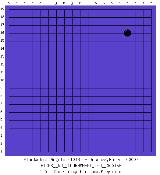 Last move : 1-0 2014 September 12 7:40:21 [Event "FICGS__GO__TOURNAMENT_KYU__000158"] [Site "FICGS"] [Date "2014.08.11"] [Round "1"] [Black "Piantadosi,Angelo"] [White "Desouza,Romeo"] [Result "1-0"] [Rating 1 "1013"] [Rating 2 "0000"] 1.q16 1-0 This go game has been lost on time (started : 2014.08.11 7:54:37) Here are the names of the openings (joseki) played in the four corners : Player Black won this Go (weiqi, baduk) game. Follow this game move after move (download)Don't be greedy ! (Anonymous) Computer Science is no more about computers than astronomy is about telescopes. (Edsger W. Dijkstra)