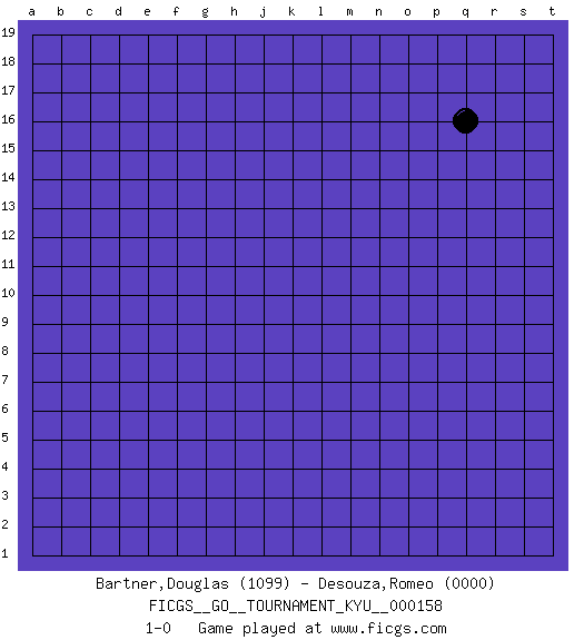 Last move : 1-0 2014 September 10 19:39:35 [Event "FICGS__GO__TOURNAMENT_KYU__000158"] [Site "FICGS"] [Date "2014.08.11"] [Round "1"] [Black "Bartner,Douglas"] [White "Desouza,Romeo"] [Result "1-0"] [Rating 1 "1099"] [Rating 2 "0000"] 1.q16 1-0 This go game has been lost on time (started : 2014.08.11 7:54:37) Here are the names of the openings (joseki) played in the four corners : Player Black won this Go (weiqi, baduk) game. Follow this game move after move (download)You can hide nothing on the goban. (Pierre Audouard) Every now and then a man's mind is stretched by a new idea and never shrinks back to its former dimensions. (Oliver Wendell Holmes, Sr.)