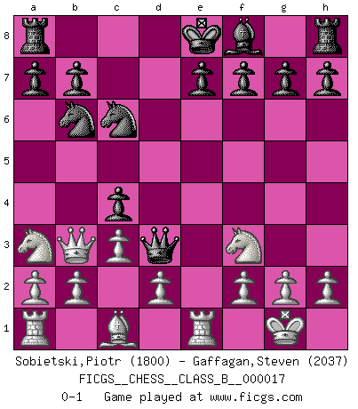 Last move : 0-1 2007 August 2 7:50:11 [Event "FICGS__CHESS__CLASS_B__000017"] [Site "FICGS"] [Date "2007.02.21"] [Round "1"] [White "Sobietski,Piotr"] [Black "Gaffagan,Steven"] [Result "0-1"] [WhiteElo "1800"] [BlackElo "2037"] 1.e4 c5 2.c3 Nf6 3.e5 Nd5 4.Nf3 Nc6 5.Bc4 Nb6 6.Bb3 d5 7.exd6 Qxd6 8.O-O Be6 9.Na3 Bxb3 10.Qxb3 Qd3 11.Re1 c4 0-1 Sicilian : Alapin's variation (2.c3) Kingside Castling by player White (move 8) Player Black won this chess game. Follow this game move after move (download)There just isn't enough televised Chess. (David Letterman) Der 70jährige Viktor Kortschnoi: Die Rentenanstalt wollte mich zwingen in Rente zu gehen. Meine Frau erhält jetzt eine Pension- und ich zahle weiter in die Rentenkasse ein! (Viktor Kortschnoi) En un gambito tu regalas un Peón por el bién de tomar un juego perdido. (Samuel Standige Boden) Il n'y a pas eu de défaite parce que je ne crois pas que cet ordinateur ait jamais existé. IBM a triché en refusant d'imprimer les modes de recherche de la machine. C'est évident, pendant le match, des coups décisifs ont été joués par des êtres humains. Aujourd'hui, les meilleurs spécialistes en informatique ne peuvent toujours pas expliquer comment Deep-Blue a pu jouer contre la logique des ordinateurs. IBM a gagné une guerre de communication, mais ils sont incapables de prouver que l'ordinateur a gagné tout seul. (Garry Kasparov) If you are good, you will be assigned all the work. If you are really good, you will get out of it. (Dan Rotaru)