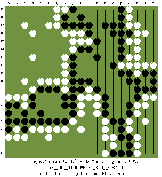 Last move : 0-1 2014 September 24 21:21:13 [Event "FICGS__GO__TOURNAMENT_KYU__000158"] [Site "FICGS"] [Date "2014.08.11"] [Round "1"] [Black "Kehayov,Yulian"] [White "Bartner,Douglas"] [Result "0-1"] [Rating 1 "0847"] [Rating 2 "1099"] 1.r16 d16 2.q3 d4 3.q10 q5 4.p5 q4 5.p4 r3 6.q2 r2 7.q6 r6 8.q7 k4 9.c6 f3 10.g5 h4 11.h5 g4 12.f5 c10 13.n17 f17 14.h17 d13 15.c4 c3 16.d5 e4 17.e5 n3 18.k10 r14 19.r12 p16 20.p17 q17 21.o17 r17 22.q16 s16 23.p15 q15 24.o16 r15 25.p14 k16 26.k17 h16 27.l17 l15 28.m13 q13 29.p13 q12 30.p11 p12 31.o12 r11 32.q11 r13 33.n6 k6 34.h7 k8 35.j9 o3 36.p3 r7 37.r8 s5 38.m9 g17 39.j17 j16 40.g9 f10 41.f9 g10 42.j12 h13 43.j13 h12 44.l14 c8 45.d8 c7 46.d7 c17 47.m15 m7 48.n7 m8 49.n8 l9 50.l10 d9 51.e9 e10 52.e6 b4 53.b5 b3 54.b7 b8 55.a6 s8 56.r9 j14 57.k14 j15 58.l16 p16 59.c5 j5 60.j6 m6 61.k9 l8 62.j8 n5 63.o5 n4 64.r10 s12 65.s9 s7 66.s11 r12 67.t10 h11 68.j11 g18 69.h18 q18 70.p18 o2 71.q16 a8 72.a7 k7 73.j7 k15 74.q1 r1 75.a5 f4 76.t11 t12 77.o1 n1 78.p1 t8 79.t9 h9 80.h8 h10 81.j10 q19 82.p19 h19 83.j19 g19 84.a4 a3 85.k18 r16 86.p16 pass 0-1 Here are the names of the openings (joseki) played in the four corners : Corner q4 : q3 q5 Komoku (Somok, Xiao~mu`) 3-4 Point. The komoku (3-4) point is the traditional corner enclosure move.. Ikken Takagakari (Hankan Nop'dakeolch'im, Yi Gaogua`jiao~, 1-Space High Approach). The 5-4 approach move has become more popular in modern times, as modern Go emphasizes speed and influence. Corner d4 : d4 c6 Hoshi (Hwajeom, Seongjeom, Xingwei`) 4-4 Point. The star or hoshi (4-4) point, emphasizing influence at the potential expense of territory. Ikken Kakari (Hankan Keolch'im, Yi Gua`jiao~, 1-Space Low Approach). Black 2 is the standard approach move to the 4-4. Player White won this Go (weiqi, baduk) game. Follow this game move after move (download)Six eyes in a rectangle are alive. (Anonymous) Even the best needles are not sharp at both ends. (Chinese proverb)
