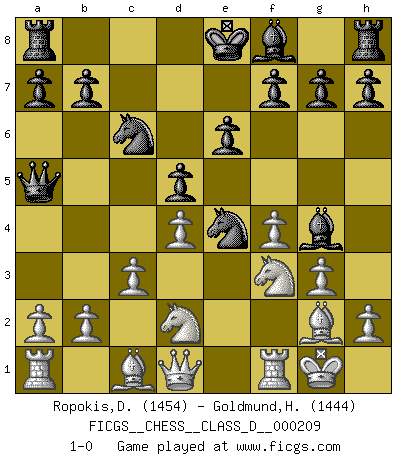 Last move : 1-0 2014 September 28 19:20:40 [Event "FICGS__CHESS__CLASS_D__000209"] [Site "FICGS"] [Date "2014.08.13"] [Round "1"] [White "Ropokis,Dimitrios"] [Black "Goldmund,Heike"] [Result "1-0"] [WhiteElo "1454"] [BlackElo "1444"] 1.f4 d5 2.Nf3 Nf6 3.e3 Bg4 4.g3 e6 5.Bg2 c5 6.d4 Ne4 7.Nbd2 Qa5 8.O-O Nc6 9.c3 cxd4 10.exd4 1-0 Bird's Opening Kingside Castling by player White (move 8) Player White won this chess game. Follow this game move after move (download)Live, lose, and learn, by observing your opponent how to win. (Amber Steenbock) Es hat in meinem Leben Zeiten gegeben, da ich sehr nahe daran war zu glauben, daß ich auch nicht eine einzige Schachpartie verlieren könnte. (José Raúl Capablanca) Combinaciones deslumbrantes son para la mayoría, mover madera es para los pocos. (Georg Kieninger) On a dit que l'homme se distingue de l'animal par le fait qu'il achète plus de livres qu'il ne peut en lire. Je voudrais suggérer qu'inclure à la liste des livres quelques livres d'échecs rendrait la distinction manifeste. (Edward Lasker) Just because you do not take an interest in politics doesn't mean politics won't take an interest in you. (Pericles 430 B.C.)