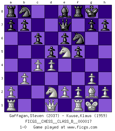 Last move : 1-0 2007 August 6 2:15:39 [Event "FICGS__CHESS__CLASS_B__000017"] [Site "FICGS"] [Date "2007.02.21"] [Round "1"] [White "Gaffagan,Steven"] [Black "Kuuse,Klaus"] [Result "1-0"] [WhiteElo "2037"] [BlackElo "1959"] 1.c4 f5 2.g3 Nf6 3.Bg2 e6 4.d4 Be7 5.Nf3 O-O 6.O-O c6 7.b3 d5 8.Ba3 Bd7 9.Bxe7 Qxe7 10.Nbd2 Be8 11.Ne5 1-0 English : Anglo-Dutch defense Kingside Castling by player Black (move 5) Kingside Castling by player White (move 6) Player White won this chess game. Follow this game move after move (download)It is the aim of the modern school, not to treat every position according to one general law, but according to the principle inherent in the position. (Richard Reti) Das Spiel gibt uns die Genugtuung, die das Leben uns versagt. (Emanuel Lasker) No existe un remordimiento como el remordimiento del Ajedrez. (H. G. Wells) Le système Elo représente seulement une moyenne. Il est simplement un indicateur de votre stabilité. (Anatoli Karpov) For to win one hundred victories in one hundred battles is not the acme of skill. To subdue the enemy without fighting is the acme of skill. (Sun Tzu)