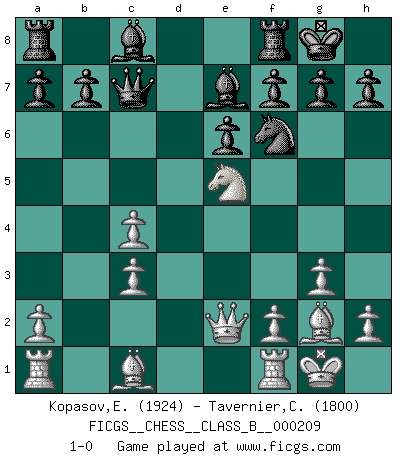 Last move : 1-0 2014 November 16 22:56:19 [Event "FICGS__CHESS__CLASS_B__000209"] [Site "FICGS"] [Date "2014.08.14"] [Round "1"] [White "Kopasov,Evgeny"] [Black "Tavernier,Christopher"] [Result "1-0"] [WhiteElo "1924"] [BlackElo "1800"] 1.d4 Nf6 2.c4 e6 3.Nc3 Bb4 4.Qc2 O-O 5.Nf3 c5 6.dxc5 Na6 7.g3 Nxc5 8.Bg2 Nce4 9.O-O Nxc3 10.bxc3 Be7 11.e4 d6 12.e5 dxe5 13.Nxe5 Qc7 14.Qe2 1-0 This chess game has been lost on time (started : 2014.08.14 14:11:38) Nimzo-Indian : Classical variation Kingside Castling by player Black (move 4) Kingside Castling by player White (move 9) Player White won this chess game. Follow this game move after move (download)The chessboard is the world, the pieces are the phenomena of the Universe, the rules of the game are what we call the laws of Nature and the player on the other side is hidden from us. (Thomas Huxley) Wenn Dein Gegner dir ein Remis anbietet, versuch herauszufinden, weshalb er glaubt schlechter zu stehen. (Nigel Short) Los errores estan ahí, esperando a que se cometan. (Savielly Tartakower) A ce moment-là, je menaçais de comprendre la position ! (Clément L'Heureux) Wawaweewa ! (Borat: Cultural learnings of America for make benefit glorious nation of Kazakhstan)
