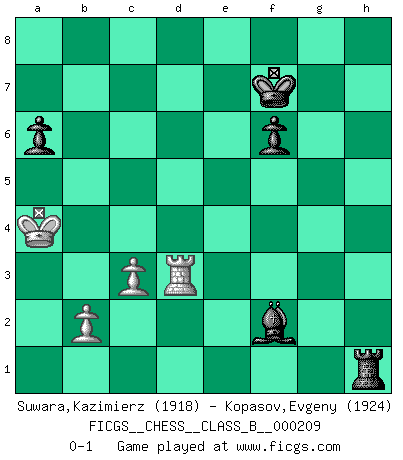 Last move : 0-1 2015 March 1 17:38:30 [Event "FICGS__CHESS__CLASS_B__000209"] [Site "FICGS"] [Date "2014.08.14"] [Round "1"] [White "Suwara,Kazimierz"] [Black "Kopasov,Evgeny"] [Result "0-1"] [WhiteElo "1918"] [BlackElo "1924"] 1.e4 c5 2.Nf3 d6 3.Bb5+ Nd7 4.d4 cxd4 5.Qxd4 a6 6.Bxd7+ Bxd7 7.Nc3 e5 8.Qd5 Qc7 9.Qd3 Be6 10.Be3 Nf6 11.Bg5 Nd7 12.O-O-O Rc8 13.Nd5 Bxd5 14.exd5 g6 15.h4 Bg7 16.Kb1 O-O 17.h5 e4 18.Qxe4 Rfe8 19.Qd3 Nc5 20.Qa3 Ne4 21.Rc1 Nxf2 22.Rhf1 Ne4 23.hxg6 hxg6 24.Bf4 Qc4 25.Nd2 Nxd2+ 26.Bxd2 Re2 27.Rfd1 Qxd5 28.Qf3 Qxf3 29.gxf3 Be5 30.Bg5 Rf2 31.Rd3 f6 32.Bd2 Kf7 33.Rh1 g5 34.c3 b5 35.Be1 Rh2 36.Rxh2 Bxh2 37.Kc2 Rh8 38.Kb3 Rh3 39.a4 bxa4+ 40.Kxa4 g4 41.Rd4 gxf3 42.Rd1 Bg1 43.Rxd6 Rh1 44.Rd3 f2 45.Bxf2 Bxf2 0-1 Sicilian : Canal-Sokolsky (Nimzovich-Rossolimo, Moscow) attack Queenside Castling by player White (move 12) Kingside Castling by player Black (move 16) 10 pieces endgame at move 45 : White KRBPP , Black KRBPP WHITE : King + 1 Rook 1 Bishop 2 Pawns BLACK : King + 1 Rook 1 Bishop 2 Pawns 9 pieces endgame at move 45 : White KRPP , Black KRBPP WHITE : King + 1 Rook 2 Pawns BLACK : King + 1 Rook 1 Bishop 2 Pawns Player Black won this chess game. Follow this game move after move (download)For surely of all the drugs in the world, Chess must be the most permanently pleasurable. (Assiac) Schon mancher Spieler hat aufgegeben, um zu vermeiden, daß er eine Figur verliert. (Savielly Grigorievitsch Tartakower) El Ajedrez es como la guerra en un tablero. (Bobby Fischer) Mais n'est-ce pas déjà le limiter injurieusement que d'appeler les échecs un jeu? N'est-ce pas aussi une science, un art, ou quelque chose qui, comme le cercueil de Mahomet entre ciel et terre, est suspendu entre l'un et l'autre, et qui réunit un nombre incroyable de contraires ? (Stefan Zweig) Methinks King Thibault should dub Marius Zubac a knight of the square board... I mean table, henceforth addressing him as Sir Marius, and bestow on him a suitable land from the kingdom of FICGS & marry him off to a worthy, fair maiden, lest he slice our heads with his mighty sword in his wrath. (Dinesh De Silva)