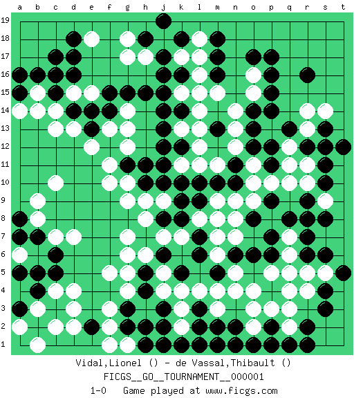 Last move : 1-0 2006 December 2 2:58:52 [Event "FICGS__GO__TOURNAMENT__000001"] [Site "FICGS"] [Date "2006.05.26"] [Round "1"] [Black "Vidal,Lionel"] [White "de Vassal,Thibault"] [Result "1-0"] 1.r16 q3 2.d17 d4 3.c15 c10 4.p17 r10 5.q5 r5 6.r6 r4 7.o6 o4 8.r8 k3 9.r12 p5 10.p6 f3 11.k16 c7 12.m5 c13 13.e14 g17 14.j17 e18 15.d18 s12 16.s13 c16 17.d16 b15 18.b16 d15 19.c17 j18 20.k18 q7 21.r7 q6 22.q8 q4 23.p7 n4 24.h18 h17 25.j14 e15 26.d14 c14 27.c16 e12 28.f14 q12 29.s11 g12 30.j12 r13 31.t12 r11 32.q13 r14 33.p12 q11 34.p11 p10 35.s10 o9 36.p9 o10 37.r9 q10 38.p14 s14 39.s12 n8 40.j8 n12 41.m10 l8 42.k10 k7 43.k5 j7 44.h5 g7 45.k8 g6 46.l7 m7 47.l6 n5 48.n6 m6 49.j3 j4 50.h4 k4 51.g2 j5 52.e2 c2 53.j2 k2 54.k1 f5 55.l2 n14 56.j6 h6 57.n2 o15 58.p15 l15 59.n11 l13 60.k14 l14 61.m16 m15 62.o13 g18 63.j19 h8 64.l9 m8 65.p2 q2 66.h10 f10 67.c3 f2 68.g3 g4 69.b2 d2 70.b5 b1 71.a3 o11 72.o12 o16 73.p16 l16 74.m17 l17 75.m18 l18 76.o17 g14 77.g15 g13 78.h15 g9 79.b7 b8 80.c6 c4 81.b4 d7 82.a8 b9 83.c5 a6 84.a5 d3 85.a7 m3 86.m2 b3 87.l3 l4 88.c3 p1 89.o1 g1 90.q1 o3 91.r2 b3 92.s3 a2 93.s4 s5 94.s6 o2 95.t5 n1 96.m1 n13 97.o14 m11 98.n10 k13 99.j13 l11 100.k12 k11 101.j11 k15 102.j15 k17 103.j16 l12 104.m13 j9 105.k9 h9 106.j10 m9 107.l10 n9 108.h1 h3 109.h2 b14 110.a15 d13 111.f15 a14 112.a16 f1 113.o8 m4 114.r1 s9 115.s8 g5 116.j1 q5 117.g11 f11 118.p1 n7 119.n1 g10 120.h11 p3 121.l1 f13 122.e13 1-0 Here are the names of the openings (joseki) played in the four corners : Corner q4 : q3 q5 Komoku (Somok, Xiao~mu`) 3-4 Point. The komoku (3-4) point is the traditional corner enclosure move.. Ikken Takagakari (Hankan Nop'dakeolch'im, Yi Gaogua`jiao~, 1-Space High Approach). The 5-4 approach move has become more popular in modern times, as modern Go emphasizes speed and influence. Player Black won this Go (weiqi, baduk) game. Follow this game move after move (download)If you don't know ladders, don't play go. (Anonymous) I don't diet. I just don't eat as much as I'd like to. (Linda Evangelista, supermodel)