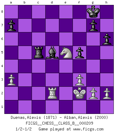 Last move : 1/2-1/2 2014 August 26 15:10:40 [Event "FICGS__CHESS__CLASS_B__000209"] [Site "FICGS"] [Date "2014.08.14"] [Round "1"] [White "Duenas,Alexis"] [Black "Alban,Alexis"] [Result "1/2-1/2"] [WhiteElo "1871"] [BlackElo "2000"] 1.d4 Nf6 2.c4 e6 3.Nc3 Bb4 4.Qc2 O-O 5.a3 Bxc3+ 6.Qxc3 b6 7.Bg5 Bb7 8.f3 h6 9.Bh4 d5 10.e3 Nbd7 11.cxd5 Nxd5 12.Bxd8 Nxc3 13.Bh4 Nd5 14.Bf2 c5 15.e4 Ne7 16.Ne2 f5 17.exf5 Nxf5 18.dxc5 Nxc5 19.Bxc5 bxc5 20.Rc1 Rac8 21.Nf4 Bd5 22.Ng6 Rf7 23.Ne5 Rfc7 24.Bd3 c4 25.Bxf5 exf5 26.Kf2 c3 27.bxc3 Rxc3 28.Rxc3 Rxc3 29.Rd1 Rc5 30.Rd2 1/2-1/2 Nimzo-Indian : Classical variation Kingside Castling by player Black (move 4) This chess game ended in a draw. Follow this game move after move (download)The isolated Pawn casts gloom over the entire chessboard. (Aaron Nimzovich) Wir können eben der zündenden Macht des Opfers nicht wiederstehen, denn die Begeisterung für das Opfer liegt in der Natur des Menschen. (Rudolf Spielmann) Me gusta decir que Bobby Fischer fue el mejor jugador que jamás haya existido. Pero lo que hizo de Fischer un genio, fue su habilidad de mezclar una frescura y pragmatismo Americano con ideas Rusas acerca de la estrategia. (Bruce Pandolfini) Il n'y a pas eu de défaite parce que je ne crois pas que cet ordinateur ait jamais existé. IBM a triché en refusant d'imprimer les modes de recherche de la machine. C'est évident, pendant le match, des coups décisifs ont été joués par des êtres humains. Aujourd'hui, les meilleurs spécialistes en informatique ne peuvent toujours pas expliquer comment Deep-Blue a pu jouer contre la logique des ordinateurs. IBM a gagné une guerre de communication, mais ils sont incapables de prouver que l'ordinateur a gagné tout seul. (Garry Kasparov) A shortcut is the longest distance between two points. (Don Groves)