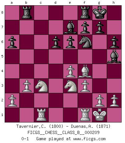 Last move : 0-1 2014 November 4 10:14:17 [Event "FICGS__CHESS__CLASS_B__000209"] [Site "FICGS"] [Date "2014.08.14"] [Round "1"] [White "Tavernier,Christopher"] [Black "Duenas,Alexis"] [Result "0-1"] [WhiteElo "1800"] [BlackElo "1871"] 1.e4 c5 2.d4 cxd4 3.c3 dxc3 4.Nxc3 Nc6 5.Nf3 d6 6.Bc4 a6 7.O-O Nf6 8.Bg5 Bg4 9.Qb3 e6 10.Qxb7 Na5 11.Qb4 Nxc4 12.Qxc4 Qc8 13.Nd2 Qxc4 14.Nxc4 Rc8 15.Ne3 Bh5 16.Rac1 Rb8 17.b3 Be7 18.f3 h6 19.Bf4 O-O 0-1 This chess game has been lost on time (started : 2014.08.14 14:11:38) Sicilian : Smith-Morra gambit Kingside Castling by player White (move 7) Kingside Castling by player Black (move 19) Player Black won this chess game. Follow this game move after move (download)It is peculiar but a fact nevertheless, that gamblers in chess always have enthusiastic followers. (Botvinnik) Der Schachmeister von Heute braucht Courage, einen Killerinstinkt, Ausdauer und Arroganz. (Larry Evans) Te sientas frente a un tablero y repentinamente tu corazón brinca. Tu mano tiembla al tomar una pieza y moverla. Pero lo que el Ajedrez te enseña es que tu debes permanecer ahí con calma y pensar de que si realmente es una buena idea o de que si hay otras ideas mejores. (Stanley Kubrick) Il a essayé de se convaincre qu'il pourrait empêcher toutes les erreurs et ne jamais perdre. L'horreur ! Gary Kasparov au sujet de Robert Fischer. When you have everything, sometimes it feels like nothing. (Horatio Caine, C.S.I. Miami)