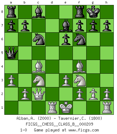 Last move : 1-0 2014 November 8 10:14:58 [Event "FICGS__CHESS__CLASS_B__000209"] [Site "FICGS"] [Date "2014.08.14"] [Round "1"] [White "Alban,Alexis"] [Black "Tavernier,Christopher"] [Result "1-0"] [WhiteElo "2000"] [BlackElo "1800"] 1.d4 d5 2.c4 e6 3.Nf3 Nf6 4.Nc3 Be7 5.Bf4 O-O 6.e3 c5 7.dxc5 Bxc5 8.a3 Nc6 9.Qc2 Qa5 10.Rd1 Be7 11.Be2 dxc4 12.Bxc4 1-0 This chess game has been lost on time (started : 2014.08.14 14:11:38) Queen's gambit declined Kingside Castling by player Black (move 5) Player White won this chess game. Follow this game move after move (download)Pawns: they are the soul of this game, they alone form the attack and defense. (Philidor) Glücklicherweise sind Großmeister Ruben Fines reine Schachbücher weniger phallozentrisch [als seine Schachpsychologie] und deswegen auch weniger lächerlich. (Nigel Short) El Ajedrez, como cualquier actividad creativa, solo puede existir a través del esfuerzo combinado de aquellos que tienen talento creativo y de aquellos que poseen la habilidad de organizar su trabajo creativo. (Mikhail Botvinnik) Seul un grand joueur sait à quel point il joue faiblement. (Xavier Tartacover) Two beer, or not two beer. (Unknown)