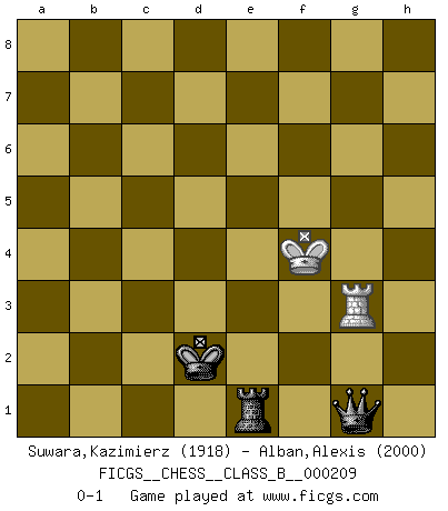 Last move : 0-1 2015 June 1 11:32:56 [Event "FICGS__CHESS__CLASS_B__000209"] [Site "FICGS"] [Date "2014.08.14"] [Round "1"] [White "Suwara,Kazimierz"] [Black "Alban,Alexis"] [Result "0-1"] [WhiteElo "1918"] [BlackElo "2000"] 1.e4 c5 2.Nf3 d6 3.Bb5+ Nc6 4.c3 Nf6 5.Qe2 Bg4 6.O-O e6 7.h3 Bxf3 8.Bxc6+ bxc6 9.Qxf3 d5 10.e5 Nd7 11.Re1 Qb8 12.d4 a5 13.Nd2 cxd4 14.cxd4 c5 15.Qe3 cxd4 16.Qxd4 Bb4 17.a3 Bc5 18.Qg4 O-O 19.Nf3 Rd8 20.Rb1 Rc8 21.Bh6 Bf8 22.Bf4 Ra6 23.Ng5 h6 24.Nf3 Rb6 25.Bxh6 Rc4 26.Bf4 Bc5 27.Re2 Bxa3 28.Nd2 Rd4 29.Nf3 Rdb4 30.Ra1 Rxb2 31.Rxb2 Bxb2 32.Rxa5 Nxe5 33.Qg3 Nxf3+ 34.Qxf3 Be5 35.Bxe5 Qxe5 36.Ra8+ Rb8 37.Qe3 Qd6 38.Ra1 d4 39.Qd3 Rd8 40.h4 Qe5 41.g3 g6 42.Kg2 Kg7 43.Ra7 Qd5+ 44.Qf3 d3 45.Qxd5 Rxd5 46.Ra1 Kh6 47.f3 d2 48.Rd1 e5 49.g4 f5 50.Kf2 Rd4 51.Ke3 fxg4 52.fxg4 Rxg4 53.Rxd2 Kh5 54.Rd5 Kxh4 55.Rxe5 g5 56.Kf2 Kh3 57.Kf1 Kh2 58.Rf5 Rg1+ 59.Kf2 Rg3 60.Rd5 g4 61.Rg5 Rf3+ 62.Ke2 Kh3 63.Rh5+ Kg2 64.Rg5 g3 65.Rg8 Ra3 66.Rg7 Kg1 67.Rg5 g2 68.Rh5 Rb3 69.Rh7 Rb5 70.Ke3 Re5+ 71.Kf4 Re1 72.Rh3 Kf1 73.Rf3+ Ke2 74.Re3+ Kd2 75.Rg3 g1Q 0-1 Sicilian : Canal-Sokolsky (Nimzovich-Rossolimo, Moscow) attack Kingside Castling by player White (move 6) Kingside Castling by player Black (move 18) 10 pieces endgame at move 51 : White KRPP , Black KRPPPP WHITE : King + 1 Rook 2 Pawns BLACK : King + 1 Rook 4 Pawns 9 pieces endgame at move 52 : White KRPP , Black KRPPP WHITE : King + 1 Rook 2 Pawns BLACK : King + 1 Rook 3 Pawns 8 pieces endgame at move 52 : White KRP , Black KRPPP WHITE : King + 1 Rook 1 Pawn BLACK : King + 1 Rook 3 Pawns 7 pieces endgame at move 53 : White KRP , Black KRPP WHITE : King + 1 Rook 1 Pawn BLACK : King + 1 Rook 2 Pawns 6 pieces endgame at move 54 : White KR , Black KRPP WHITE : King + 1 Rook BLACK : King + 1 Rook 2 Pawns 5 pieces endgame at move 55 : White KR , Black KRP WHITE : King + 1 Rook BLACK : King + 1 Rook 1 Pawn Promotion Queen by player Black (move 75) Player Black won this chess game. Follow this game move after move (download)Personally, I rather look forward to a computer program winning the world Chess Championship. Humanity needs a lesson in humility. (Richard Dawkings) Unter Putin wird alles Geld aus Russland wie von einem Staubsauger nach Moskau umgeleitet, das ist wie ein schwarzes Loch. (Garry Kasparov) El Ajedrez expande y enriquece tu mente. (Saudin Robovic) Les Echecs ont trois composantes : le temps, l'espace et le matériel en dernier. (Mikhail Tal) Perfection is achieved, not when there is nothing more to add, but when there is nothing left to take away. (Antoine de Saint-Exupéry)