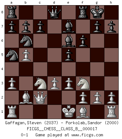 Last move : 0-1 2007 July 6 3:56:37 [Event "FICGS__CHESS__CLASS_B__000017"] [Site "FICGS"] [Date "2007.02.21"] [Round "1"] [White "Gaffagan,Steven"] [Black "Porkolab,Sandor"] [Result "0-1"] [WhiteElo "2037"] [BlackElo "2000"] 1.c4 Nf6 2.Nc3 e5 3.Nf3 Nc6 4.a3 d5 5.cxd5 Nxd5 6.Qc2 Be7 7.e3 O-O 8.b4 Be6 9.Bb2 Nb6 10.b5 Na5 11.d3 f6 0-1 This chess game has been lost on time (started : 2007.02.21 1:17:8) English Opening Kingside Castling by player Black (move 7) Player Black won this chess game. Follow this game move after move (download)Chess books should be used as we use glasses: to assist the sight, although some players make use of them as if they thought they conferred sight. (Jose Raul Capablanca) Gegen einen Schachcomputer zu verlieren ist wie Löcher in den Strümpfen zuhaben. Es ist nicht peinlich, solange man der einzige ist der es weiß. (Anonymous) El arma más poderosa en el Ajedrez, es tener la próxima movida. (David Bronstein) 'L'échange des dames est un coup dur pour les deux adversaires...' Un journaliste lors d'une partie du match Spassky-Fischer Think like a man of action, act like a man of thought. (Henri Louis Bergson)