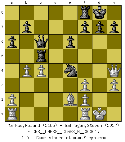 Last move : 1-0 2007 June 2 17:56:27 [Event "FICGS__CHESS__CLASS_B__000017"] [Site "FICGS"] [Date "2007.02.21"] [Round "1"] [White "Markus,Roland"] [Black "Gaffagan,Steven"] [Result "1-0"] [WhiteElo "2165"] [BlackElo "2037"] 1.e4 c5 2.c3 d5 3.exd5 Qxd5 4.d4 Nf6 5.Nf3 Bg4 6.Be2 e6 7.Na3 Nc6 8.h3 Bh5 9.Be3 cxd4 10.Nb5 Rc8 11.Nbxd4 Nxd4 12.Bxd4 a6 13.O-O Bc5 14.c4 Qe4 15.Bxc5 Rxc5 16.Qd6 Qc6 17.Qg3 O-O 18.b4 Ne4 19.Qh4 Bxf3 20.gxf3 1-0 This chess game has been lost on time (started : 2007.02.21 1:17:8) Sicilian : Alapin's variation (2.c3) Kingside Castling by player White (move 13) Kingside Castling by player Black (move 17) Player White won this chess game. Follow this game move after move (download)One bad move nullifies forty good ones. (Horowitz) Wer der Ansicht ist, daß alle Schachspieler verrückt sind, wird durch Studium des Lebens von Emil Josef Diemer nicht auf andere Gedanken kommen. (Hans Ree) Un buen sacrificio es aquel que aunque no sea necesariamente sólido, deja a tu oponente aturdido y confuso. (Rudolph Spielmann) J'ai toujours senti une vague pitié pour l'homme qui ne connaît rien aux échecs, tout comme j'en aurais pour un homme ignorant de l'amour. Les Echecs, comme la musique ou comme l'amour, ont le pouvoir de rendre heureux. (Siegbert Tarrasch) Winning isn't everything... but losing is nothing. (Mednis)