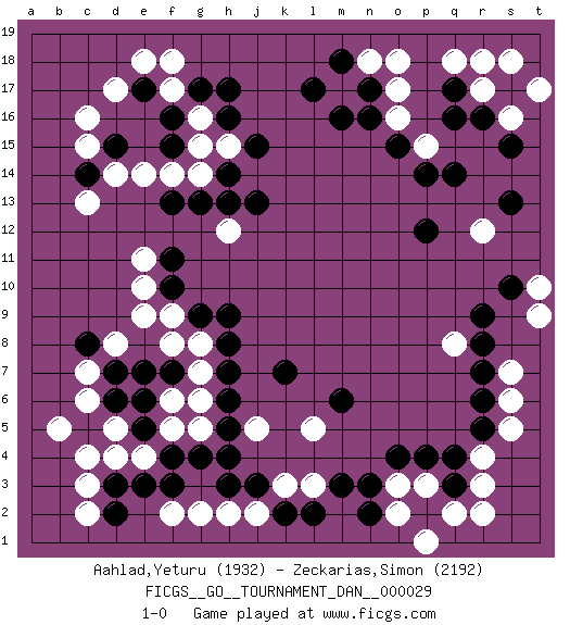 Last move : 1-0 2015 January 29 23:6:54 [Event "FICGS__GO__TOURNAMENT_DAN__000029"] [Site "FICGS"] [Date "2014.08.15"] [Round "1"] [Black "Aahlad,Yeturu"] [White "Zeckarias,Simon"] [Result "1-0"] [Rating 1 "1932"] [Rating 2 "2192"] 1.q16 d17 2.q4 d4 3.d15 o17 4.f16 f17 5.g17 g16 6.e17 f18 7.f15 e18 8.h16 c15 9.c14 c16 10.q14 r12 11.r9 r17 12.q17 q18 13.r16 s18 14.s17 r18 15.n16 l3 16.n17 s16 17.s15 t17 18.n3 r3 19.q3 r4 20.r5 s5 21.r6 s6 22.r7 q2 23.p2 r2 24.j3 l5 25.f3 c6 26.d2 p3 27.p4 o3 28.o4 o2 29.n2 p1 30.m6 j5 31.c8 f5 32.f7 c3 33.h7 c2 34.k7 d14 35.e5 e4 36.f4 g5 37.e6 h2 38.h3 j2 39.k2 k3 40.l2 g2 41.h4 f2 42.h5 c13 43.p12 q8 44.r8 g15 45.h14 h15 46.j15 g14 47.g13 f14 48.f13 e14 49.j13 h12 50.h13 e11 51.f11 e10 52.f10 e9 53.c5 d5 54.d6 c7 55.d7 b5 56.e3 f9 57.g9 g8 58.h9 d8 59.h8 f6 60.e7 g7 61.g4 g6 62.h6 f8 63.m3 o16 64.o15 n18 65.m18 o18 66.d3 c4 67.l17 p15 68.p14 s7 69.s13 t10 70.s10 t9 71.h17 m17 72.m16 1-0 Here are the names of the openings (joseki) played in the four corners : Corner d16 : d17 d15 Komoku (Somok, Xiao~mu`) 3-4 Point. The komoku (3-4) point is the traditional corner enclosure move.. Ikken Takagakari (Hankan Nop'dakeolch'im, Yi Gaogua`jiao~, 1-Space High Approach). The 5-4 approach move has become more popular in modern times, as modern Go emphasizes speed and influence. Corner q16 : q16 o17 Hoshi (Hwajeom, Seongjeom, Xingwei`) 4-4 Point. The star or hoshi (4-4) point, emphasizing influence at the potential expense of territory. Ikken Kakari (Hankan Keolch'im, Yi Gua`jiao~, 1-Space Low Approach). White 2 is the standard approach move to the 4-4. Corner d4 : d4 j3 Hoshi (Hwajeom, Seongjeom, Xingwei`) 4-4 Point. The star or hoshi (4-4) point, emphasizing influence at the potential expense of territory. Player Black won this Go (weiqi, baduk) game. Follow this game move after move (download)Strike at the waist of the knight's move. (Anonymous) Heh, heh, heh. Time to abandon ship. (General Grievous in Star Wars ep.3)