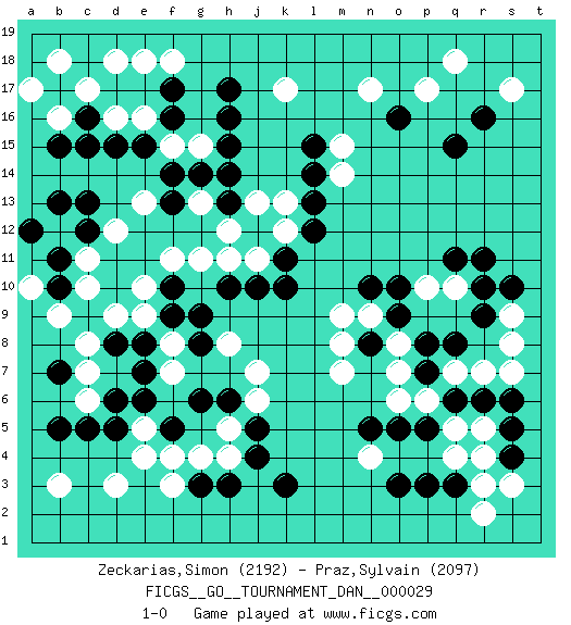 Last move : 1-0 2015 January 14 14:36:11 [Event "FICGS__GO__TOURNAMENT_DAN__000029 "] [Site "FICGS"] [Date "2014.08.15"] [Round "1"] [Black "Zeckarias,Simon "] [White "Praz,Sylvain "] [Result "1-0"] [Rating 1 "2192"] [Rating 2 "2097"] 1.r16 d16 2.q3 d3 3.d5 p17 4.q15 q5 5.o16 n17 6.q8 n4 7.p5 p6 8.o5 q4 9.o3 r3 10.p3 o6 11.n5 r2 12.q6 q7 13.r6 r7 14.s5 r5 15.s6 s7 16.s4 r4 17.p7 s9 18.r9 s8 19.d15 e16 20.e15 f15 21.f16 g15 22.c16 c17 23.b17 d18 24.f17 e18 25.h16 f18 26.h17 b16 27.c15 b18 28.b15 a17 29.h14 o7 30.p8 m7 31.s10 s3 32.f13 c7 33.b5 f4 34.e6 c10 35.h3 h4 36.j4 h5 37.g3 f3 38.j5 j6 39.h6 g4 40.k3 j7 41.g6 b3 42.c12 b12 43.b11 c11 44.b10 d12 45.c13 b9 46.b13 a10 47.a12 d9 48.f9 f8 49.e8 e9 50.g8 f7 51.e7 f11 52.f10 e10 53.h10 g11 54.k10 q18 55.r11 q10 56.q11 p10 57.r10 k17 58.h15 n9 59.n8 o8 60.o9 m8 61.n10 m9 62.o10 h11 63.j10 g13 64.g14 k12 65.j12 j11 66.k11 j13 67.l12 k13 68.l13 h8 69.g9 m15 70.l15 e13 71.h13 h12 72.f14 m14 73.l14 s17 74.d8 c8 75.b7 c6 76.c5 e5 77.f5 e4 78.d6 1-0 Here are the names of the openings (joseki) played in the four corners : Corner d4 : d3 d5Komoku (Somok, Xiao~mu`) 3-4 Point. The komoku (3-4) point is the traditional corner enclosure move..Ikken Takagakari (Hankan Nop'dakeolch'im, Yi Gaogua`jiao~, 1-Space High Approach). The 5-4 approach move has become more popular in modern times, as modern Go emphasizes speed and influence. Corner q16 : r16 p17Komoku (Somok, Xiao~mu`) 3-4 Point. The komoku (3-4) point is the traditional corner enclosure move..Ikken Kakari (Hankan Keolch'im, Yi Gua`jiao~, 1-Space Low Pincer). The small knight move is the basic approach move to the 3-4 point stone. It has been continually used for over four centuries. There are limitless variations, with new moves constantly being discovered. White 2 opens the door to a treaure store of joseki. Corner q4 : q3 q5Komoku (Somok, Xiao~mu`) 3-4 Point. The komoku (3-4) point is the traditional corner enclosure move..Ikken Takagakari (Hankan Nop'dakeolch'im, Yi Gaogua`jiao~, 1-Space High Approach). The 5-4 approach move has become more popular in modern times, as modern Go emphasizes speed and influence. Corner d16 : d16 d15Hoshi (Hwajeom, Seongjeom, Xingwei`) 4-4 Point. The star or hoshi (4-4) point, emphasizing influence at the potential expense of territory. Player Black won this Go (weiqi, baduk) game.Follow this game move after move (download ) The enemy's vital point is your own. (Anonymous) Control your own destiny or someone else will. (Jack Welch)