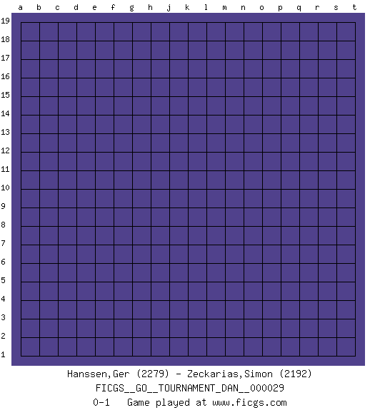 Last move : 0-1 2014 September 14 7:54:26 [Event "FICGS__GO__TOURNAMENT_DAN__000029"] [Site "FICGS"] [Date "2014.08.15"] [Round "1"] [Black "Hanssen,Ger"] [White "Zeckarias,Simon"] [Result "0-1"] [Rating 1 "2279"] [Rating 2 "2192"] 0-1 This go game has been lost on time (started : 2014.08.15 6:50:57) Here are the names of the openings (joseki) played in the four corners : Player White won this Go (weiqi, baduk) game. Follow this game move after move (download)Against three in a row, play right in the center. (Anonymous) It is a good thing for an uneducated man to read books of quotations. (Winston Churchill)