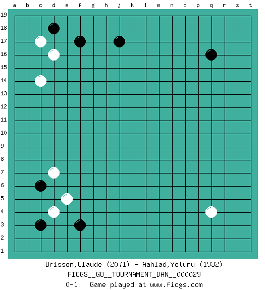 Last move : 0-1 2014 September 29 20:43:42 [Event "FICGS__GO__TOURNAMENT_DAN__000029 "] [Site "FICGS"] [Date "2014.08.15"] [Round "1"] [Black "Brisson,Claude "] [White "Aahlad,Yeturu "] [Result "0-1"] [Rating 1 "2071"] [Rating 2 "1932"] 1.q16 d4 2.f3 q4 3.c6 e5 4.c3 d16 5.f17 c14 6.d18 c17 7.j17 d7 0-1 This go game has been lost on time (started : 2014.08.15 6:50:57) Here are the names of the openings (joseki) played in the four corners : Corner d4 : d4 f3Hoshi (Hwajeom, Seongjeom, Xingwei`) 4-4 Point. The star or hoshi (4-4) point, emphasizing influence at the potential expense of territory.Ikken Kakari (Hankan Keolch'im, Yi Gua`jiao~, 1-Space Low Approach). Black 2 is the standard approach move to the 4-4. Corner d16 : d16 f17Hoshi (Hwajeom, Seongjeom, Xingwei`) 4-4 Point. The star or hoshi (4-4) point, emphasizing influence at the potential expense of territory.Ikken Kakari (Hankan Keolch'im, Yi Gua`jiao~, 1-Space Low Approach). Black 2 is the standard approach move to the 4-4. Player White won this Go (weiqi, baduk) game.Follow this game move after move (download ) Answer the keima with a kosumi. (Anonymous) Indecision is the key to flexibility. (Unknown)