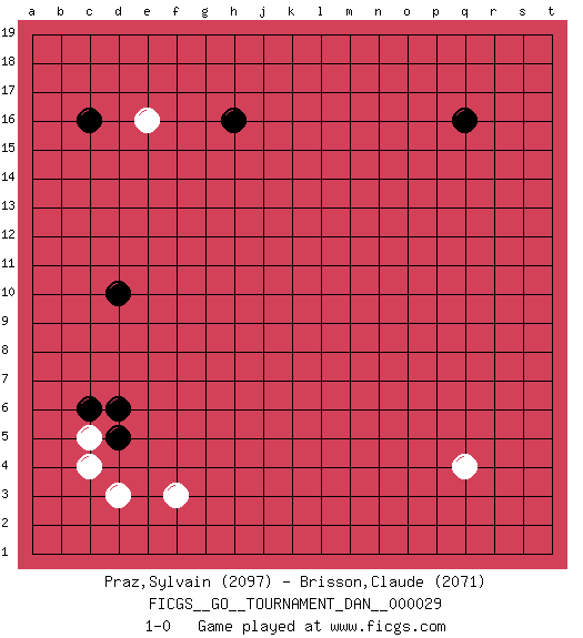 Last move : 1-0 2014 September 24 8:20:26 [Event "FICGS__GO__TOURNAMENT_DAN__000029 "] [Site "FICGS"] [Date "2014.08.15"] [Round "1"] [Black "Praz,Sylvain "] [White "Brisson,Claude "] [Result "1-0"] [Rating 1 "2097"] [Rating 2 "2071"] 1.q16 d3 2.c16 q4 3.d5 c5 4.c6 c4 5.d6 f3 6.d10 e16 7.h16 1-0 This go game has been lost on time (started : 2014.08.15 6:50:57) Here are the names of the openings (joseki) played in the four corners : Corner d4 : d3 d5Komoku (Somok, Xiao~mu`) 3-4 Point. The komoku (3-4) point is the traditional corner enclosure move..Ikken Takagakari (Hankan Nop'dakeolch'im, Yi Gaogua`jiao~, 1-Space High Approach). The 5-4 approach move has become more popular in modern times, as modern Go emphasizes speed and influence. Corner d16 : c16 e16Komoku (Somok, Xiao~mu`) 3-4 Point. The komoku (3-4) point is the traditional corner enclosure move..Ikken Takagakari (Hankan Nop'dakeolch'im, Yi Gaogua`jiao~, 1-Space High Approach). The 5-4 approach move has become more popular in modern times, as modern Go emphasizes speed and influence. Player Black won this Go (weiqi, baduk) game.Follow this game move after move (download ) One big eye kills one small eye. (Anonymous) The difference between stupidity and genius is that genius has its limits. (Murphy)