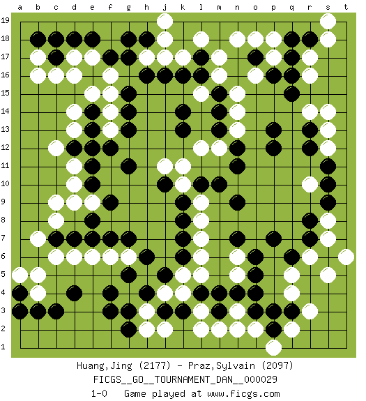 Last move : 1-0 2015 April 11 8:49:12 [Event "FICGS__GO__TOURNAMENT_DAN__000029"] [Site "FICGS"] [Date "2014.08.15"] [Round "1"] [Black "Huang,Jing"] [White "Praz,Sylvain"] [Result "1-0"] [Rating 1 "2177"] [Rating 2 "2097"] 1.q16 d16 2.d4 r3 3.o4 r6 4.k3 c6 5.f4 b4 6.c3 c9 7.f17 d14 8.k16 r14 9.r12 r17 10.q17 r16 11.q15 s14 12.p13 h17 13.h16 j17 14.j16 k17 15.l17 l18 16.g17 m17 17.l16 n18 18.h18 j19 19.c17 d17 20.d18 c16 21.b18 b17 22.c18 n15 23.o17 m16 24.m14 n14 25.m13 n13 26.p12 m12 27.n12 o16 28.p16 l15 29.k14 l12 30.k13 j18 31.n11 k5 32.k7 g4 33.f3 l3 34.l4 k4 35.m4 l2 36.j3 n3 37.n4 o2 38.h4 l6 39.n7 l7 40.k8 l8 41.k9 l9 42.n9 k10 43.j10 j11 44.l10 k11 45.m10 h5 46.g5 g6 47.j5 j4 48.h6 h3 49.g3 h2 50.k6 l5 51.g11 d11 52.r8 n6 53.o6 n5 54.o5 r10 55.s6 s7 56.r7 s8 57.s9 s5 58.q6 t6 59.s10 q5 60.p7 s12 61.s11 s13 62.d12 e12 63.c7 c8 64.e11 d10 65.e13 c12 66.d7 b7 67.f12 d6 68.e7 f15 69.g15 f14 70.g14 e6 71.f7 f6 72.g7 b16 73.b3 b5 74.o3 n2 75.q3 q2 76.p2 p1 77.p3 q4 78.r18 s18 79.q18 s19 80.g2 j2 81.g18 o18 82.e10 e9 83.f9 p18 84.m15 p17 85.a4 a5 86.a3 e17 87.e18 f13 88.g13 d13 89.e12 f16 90.e14 e15 91.m3 m2 92.e8 d9 93.r13 1-0 Here are the names of the openings (joseki) played in the four corners : Corner q4 : r3 o4 San-San (Sam-Sam, San-San) 3-3 Point. The San-San (3-3) point, emphasizing territory at the expense of influence. Niken Takagakari (Dukan Nop'dakeolch'im, E`r Gaogua`jiao~, 2-Space High Approach). White may continue with 4-5 or 4-6. White 4-6 works well when White is in the lower right (so an extension in the middle works both ways). The more conservative 4-5 is makes a slightly tighter shape (better for a fight). Corner d4 : d4 c6 Hoshi (Hwajeom, Seongjeom, Xingwei`) 4-4 Point. The star or hoshi (4-4) point, emphasizing influence at the potential expense of territory. Ikken Kakari (Hankan Keolch'im, Yi Gua`jiao~, 1-Space Low Approach). White 2 is the standard approach move to the 4-4. Corner d16 : d16 f17 Hoshi (Hwajeom, Seongjeom, Xingwei`) 4-4 Point. The star or hoshi (4-4) point, emphasizing influence at the potential expense of territory. Ikken Kakari (Hankan Keolch'im, Yi Gua`jiao~, 1-Space Low Approach). Black 2 is the standard approach move to the 4-4. Corner q16 : q16 r14 Hoshi (Hwajeom, Seongjeom, Xingwei`) 4-4 Point. The star or hoshi (4-4) point, emphasizing influence at the potential expense of territory. Ikken Kakari (Hankan Keolch'im, Yi Gua`jiao~, 1-Space Low Approach). White 2 is the standard approach move to the 4-4. Player Black won this Go (weiqi, baduk) game. Follow this game move after move (download)Everything would seem to be possible in Go. Like pulling a rabbit, by a magical move, out of a hat. (Pierre Audouard) Treat your password like your toothbrush. Don't let anybody else use it, and get a new one every six months. (Clifford Stoll)