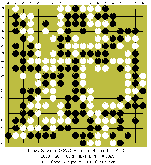 Last move : 1-0 2015 January 18 8:13:49 [Event "FICGS__GO__TOURNAMENT_DAN__000029"] [Site "FICGS"] [Date "2014.08.15"] [Round "1"] [Black "Praz,Sylvain"] [White "Ruzin,Mikhail"] [Result "1-0"] [Rating 1 "2097"] [Rating 2 "2256"] 1.r16 d16 2.q3 d4 3.f17 c14 4.l17 r9 5.r6 r12 6.r14 p12 7.q11 q12 8.o16 p16 9.p17 o17 10.p15 n16 11.q16 m17 12.l16 n15 13.o14 n14 14.o13 l14 15.s10 r10 16.s11 r11 17.s12 p6 18.q5 o4 19.m4 o2 20.n3 o3 21.h3 k3 22.k4 j4 23.j3 l4 24.k5 l3 25.l5 m5 26.m2 n4 27.m3 h17 28.j16 h16 29.k14 k13 30.h15 g15 31.h14 f16 32.j13 k15 33.j15 j12 34.k12 j14 35.h13 l12 36.k11 k14 37.j17 l11 38.k10 l10 39.k9 l9 40.k8 m6 41.c6 d6 42.d7 e6 43.c4 c3 44.c5 d3 45.c8 e7 46.e8 f8 47.f9 e9 48.d8 g9 49.f10 e10 50.e11 k6 51.j5 h18 52.c12 f11 53.g10 g11 54.h10 e12 55.d11 d12 56.b11 h12 57.f3 f4 58.c17 d17 59.b16 c18 60.b18 c16 61.b17 d18 62.b14 c13 63.b13 r7 64.o18 n17 65.s7 q6 66.s6 g4 67.e2 g3 68.g2 h5 69.j6 h6 70.j7 s8 71.q7 r8 72.p5 o6 73.n12 n11 74.o12 o11 75.n18 m18 76.b3 b2 77.b4 e3 78.f2 g7 79.d2 c2 80.d13 e13 81.d14 e14 82.c15 d15 83.r2 r13 84.s13 m1 85.l1 n1 86.k2 n19 87.p18 l7 88.l8 m8 89.o5 n5 90.d5 e5 91.m13 m14 92.h9 g8 93.a2 f6 94.g12 g13 95.h11 f12 96.j11 g12 97.p2 t7 98.s4 q14 99.q15 p4 100.q4 m12 101.n13 o15 102.p14 p1 103.q1 b19 104.o19 m19 105.l13 k18 106.l6 h4 107.k7 n2 108.l2 m7 109.t6 t9 110.t8 t10 111.s9 t7 112.l18 l19 113.t8 c10 114.c11 t7 115.j18 j19 116.t8 c14 117.c13 t7 118.k17 s14 119.k19 h19 120.k18 r15 121.s16 s15 122.t8 1-0 Sylvain Praz Thank you for the game Here are the names of the openings (joseki) played in the four corners : Corner d16 : d16 f17 Hoshi (Hwajeom, Seongjeom, Xingwei`) 4-4 Point. The star or hoshi (4-4) point, emphasizing influence at the potential expense of territory. Ikken Kakari (Hankan Keolch'im, Yi Gua`jiao~, 1-Space Low Approach). Black 2 is the standard approach move to the 4-4. Corner q4 : q3 r9 Komoku (Somok, Xiao~mu`) 3-4 Point. The komoku (3-4) point is the traditional corner enclosure move.. Corner d4 : d4 h3 Hoshi (Hwajeom, Seongjeom, Xingwei`) 4-4 Point. The star or hoshi (4-4) point, emphasizing influence at the potential expense of territory. Player Black won this Go (weiqi, baduk) game. Follow this game move after move (download)Those who are good at winning, don't usually fight. (Zhang) History is the quarrels of popes and kings, with wars or pestilences in every page; the men all so good for nothing, and hardly any women at all. (Jane Austen)