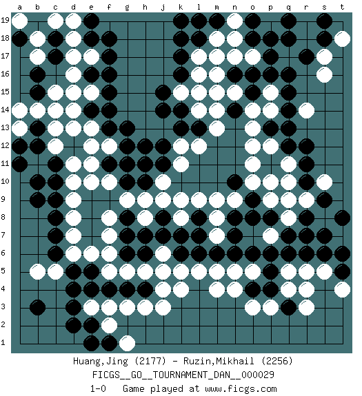 Last move : 1-0 2015 March 23 9:0:52 [Event "FICGS__GO__TOURNAMENT_DAN__000029"] [Site "FICGS"] [Date "2014.08.15"] [Round "1"] [Black "Huang,Jing"] [White "Ruzin,Mikhail"] [Result "1-0"] [Rating 1 "2177"] [Rating 2 "2256"] 1.q16 d16 2.d4 q4 3.f17 c14 4.k16 d10 5.c7 r14 6.r12 p14 7.o16 s16 8.r17 q11 9.r11 q10 10.q12 p12 11.r10 q9 12.r8 o3 13.p13 o13 14.q13 o12 15.q14 l16 16.k17 l14 17.j14 e17 18.f16 f3 19.d3 k4 20.q6 f5 21.o6 q8 22.r7 k12 23.h12 j10 24.n7 p7 25.p6 m4 26.b10 c5 27.d5 d6 28.c6 d7 29.c8 d8 30.h10 h9 31.g10 g9 32.l7 r9 33.s9 m8 34.k6 l17 35.e18 d18 36.f18 k15 37.j15 m7 38.m6 l5 39.l6 n5 40.n6 r5 41.e2 f2 42.n8 n9 43.e14 b11 44.b9 e13 45.f13 d13 46.c18 d19 47.c17 d17 48.b15 c15 49.b16 c19 50.b19 b18 51.a18 a19 52.b12 b17 53.c11 b14 54.l18 m18 55.k18 n17 56.o18 o17 57.p17 p15 58.q15 k9 59.h6 j5 60.g7 j6 61.j7 k8 62.k7 h8 63.h7 f12 64.g13 f10 65.g4 h3 66.h4 j4 67.o9 m9 68.p8 p9 69.o8 o10 70.s6 s5 71.q7 n18 72.p18 n15 73.p16 e15 74.f15 d14 75.f14 g11 76.h11 g5 77.f4 e3 78.d2 h5 79.e4 g3 80.t5 t4 81.t6 r4 82.f1 g1 83.e1 j3 84.n16 m16 85.o15 o14 86.k14 l15 87.n14 m15 88.l13 m13 89.k13 l12 90.p4 p3 91.o4 o5 92.p5 n4 93.l8 l9 94.j12 f7 95.b13 a13 96.a12 a14 97.e11 d11 98.f11 e10 99.g12 e12 100.g8 f8 101.j8 j9 102.m19 n19 103.o19 l19 104.k19 m14 105.m19 s8 106.s7 l19 107.q3 r3 108.m19 s10 109.t8 l19 110.p11 p10 111.m19 s17 112.s18 l19 113.n10 o11 114.m19 r18 115.q18 l19 116.e19 g11 117.m19 r19 118.s19 l19 119.j11 k11 120.m19 t18 121.q19 l19 122.f11 c12 123.c10 d9 124.e16 d15 125.g6 f6 126.e5 e6 127.c9 m5 128.a11 b5 129.b3 c13 130.m19 m17 131.l19 k5 132.g11 e11 133.r6 q5 134.pass 1-0 Here are the names of the openings (joseki) played in the four corners : Corner d16 : d16 f17 Hoshi (Hwajeom, Seongjeom, Xingwei`) 4-4 Point. The star or hoshi (4-4) point, emphasizing influence at the potential expense of territory. Ikken Kakari (Hankan Keolch'im, Yi Gua`jiao~, 1-Space Low Approach). Black 2 is the standard approach move to the 4-4. Corner q16 : q16 r14 Hoshi (Hwajeom, Seongjeom, Xingwei`) 4-4 Point. The star or hoshi (4-4) point, emphasizing influence at the potential expense of territory. Ikken Kakari (Hankan Keolch'im, Yi Gua`jiao~, 1-Space Low Approach). White 2 is the standard approach move to the 4-4. Player Black won this Go (weiqi, baduk) game. Follow this game move after move (download)If you have lost four corners, resign. (Anonymous) Man with more than one clock never knows what time it is. (Chinese thought)