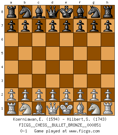 Last move : 0-1 2014 August 16 5:11:17 [Event "FICGS__CHESS__BULLET_BRONZE__000851"] [Site "FICGS"] [Date "2014.08.15"] [Round "1"] [White "Koerniawan,Eko"] [Black "Hilbert,Stephan J."] [Result "0-1"] [WhiteElo "1594"] [BlackElo "1743"] 0-1 This chess game has been lost on time (started : 2014.08.15 18:52:32) Player Black won this chess game. Follow this game move after move (download)Chess makes man wiser and clear-sighted. (Vladimir Putin) Smyslow ist ein Beweis dafür, dass ich noch zehn Jahre spielen kann! [der 75 jährige über den 85 jährigen] (Viktor Kortschnoi) En el tablero, la mentira e hipocresía no sobreviven mucho. (Emanuel Lasker) Shah mat. Le roi est mort. Cri de fierté d'un joueur venant de terrasser son adversaire, courtoisement, sans effusion de sang. Beep ! (R2D2 in Star Wars ep.3)