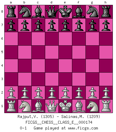 Last move : 0-1 2014 September 25 8:28:20 [Event "FICGS__CHESS__CLASS_E__000174"] [Site "FICGS"] [Date "2014.08.15"] [Round "1"] [White "Rajput,Vishalsingh"] [Black "Salinas,Marcelo"] [Result "0-1"] [WhiteElo "1305"] [BlackElo "1209"] 0-1 This chess game has been lost on time (started : 2014.08.15 21:28:47) Player Black won this chess game. Follow this game move after move (download)My opponents make good moves too. Sometimes I don't take these things into consideration. (Bobby Fischer) Ich las kürzlich ein Buch von Nietzsche. Er sagte Religion verdumme nur die Menschen. Ich stimme zu. (Robert James Fischer) Cuando le juegas a Fischer, no es una cuestion de si vas a ganar o perder. Es una cuestion de si vas a sobrevivir. (Boris Spassky) J'apprécie les joueurs d'est-indienne, c'est grâce à eux que je nourris ma famille depuis tant d'années. (Petrosian) If you don't practice you don't deserve to win. (Andre Agassi)