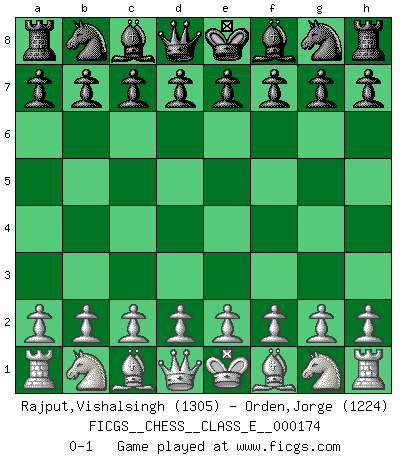 Last move : 0-1 2014 September 25 8:28:20 [Event "FICGS__CHESS__CLASS_E__000174"] [Site "FICGS"] [Date "2014.08.15"] [Round "1"] [White "Rajput,Vishalsingh"] [Black "Orden,Jorge"] [Result "0-1"] [WhiteElo "1305"] [BlackElo "1224"] 0-1 This chess game has been lost on time (started : 2014.08.15 21:28:47) Player Black won this chess game. Follow this game move after move (download)Mistrust is the most necessary characteristic of the Chess player. (Siegbert Tarrasch) Ich kenne keine einzige Person, die behaupten würde, Garri Kasparow sei ein guter Mensch (Nigel Short) La captura del Rey enemigo es la finalidad pero no el primer objetivo de la partida. (William Steinitz) Les pièces de l'échiquier étaient impitoyables. Elles le retenaient, elles l'absorbaient. Il y avait de l'horreur en cela, mais aussi une harmonie unique. Car, qu'y a-t-il dans le monde, à part les échecs ? (V. Nabokov) The quality of decision is like the well-timed swoop of a falcon which enables it to strike and destroy its victim. (Sun Tzu)