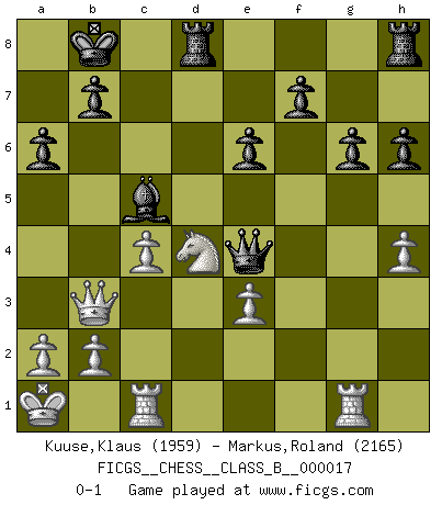 Last move : 0-1 2007 June 22 2:21:16 [Event "FICGS__CHESS__CLASS_B__000017"] [Site "FICGS"] [Date "2007.02.21"] [Round "1"] [White "Kuuse,Klaus"] [Black "Markus,Roland"] [Result "0-1"] [WhiteElo "1959"] [BlackElo "2165"] 1.e4 c6 2.d4 d5 3.Nc3 dxe4 4.Nxe4 Bf5 5.Ng3 Bg6 6.h4 h6 7.Nf3 Nd7 8.Bd3 Bxd3 9.Qxd3 Qc7 10.Bd2 Ngf6 11.O-O-O e6 12.Kb1 O-O-O 13.c4 c5 14.Qc2 cxd4 15.Nxd4 a6 16.Nde2 Bd6 17.Ne4 Nxe4 18.Qxe4 Nf6 19.Qc2 Kb8 20.Qb3 Ng4 21.Be3 Nxe3 22.fxe3 Qc6 23.Nd4 Qxg2 24.Rhg1 Qe4+ 25.Ka1 g6 26.Rc1 Bc5 0-1 Caro-Kann : Classical, 7...Nd7 Queenside Castling by player White (move 11) Queenside Castling by player Black (move 12) Player Black won this chess game. Follow this game move after move (download)Chess is a sea in which a gnat may drink and an elephant may bathe. (Hindu proverb) Wenn es im Universum noch irgendwo intelligente Lebewesen gibt, dann kennen sie Go. (Emanuel Lasker) Las leyes del Ajedrez no permiten una libre elección: tienes que mover quieras o no. (Emanuel Lasker) Mais l'homme est une créature légère et illogique : semblable au joueur d'échecs, il n'aime que le processus du but à atteindre, non le but lui-même. (Dostoïevsky) Never was anything great achieved without danger. (Niccolo Machiavelli)