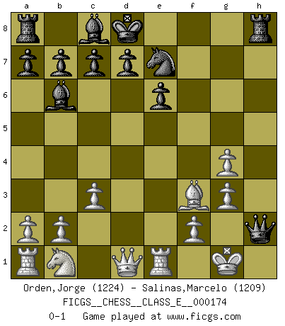 Last move : 0-1 2014 September 29 20:51:0 [Event "FICGS__CHESS__CLASS_E__000174"] [Site "FICGS"] [Date "2014.08.15"] [Round "1"] [White "Orden,Jorge"] [Black "Salinas,Marcelo"] [Result "0-1"] [WhiteElo "1224"] [BlackElo "1209"] 1.e4 e6 2.d4 Nc6 3.Nf3 Bb4+ 4.c3 Ba5 5.Be2 Qf6 6.Bg5 Qg6 7.e5 h6 8.Bd3 f5 9.exf6 Qf7 10.fxg7 Qxg7 11.Ne5 Nxe5 12.dxe5 hxg5 13.O-O Qxe5 14.Bg6+ Kd8 15.h3 Ne7 16.Re1 Qf6 17.Bh5 Bb6 18.Bf3 g4 19.hxg4 Qh4 20.g3 Qh2+ 0-1 French defense Kingside Castling by player White (move 13) Player Black won this chess game. Follow this game move after move (download)Chess demands total concentration. (Bobby Fischer) Ich kenne Menschen, die allen Willen der Welt besitzen und doch nicht Schach spielen können. (Robert James Fischer) El Ajedrez demanda una total concentración. (Bobby Fischer) Les échecs, c'est la lutte contre l'erreur. (Johannes Zukertort) If you ain't just a little scared when you enter a casino, you are either very rich or you haven't studied the games enough. (Pappy)