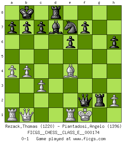 Last move : 0-1 2014 October 16 3:30:35 [Event "FICGS__CHESS__CLASS_E__000174"] [Site "FICGS"] [Date "2014.08.15"] [Round "1"] [White "Rezack,Thomas"] [Black "Piantadosi,Angelo"] [Result "0-1"] [WhiteElo "1220"] [BlackElo "1396"] 1.e4 Nf6 2.Nc3 d5 3.e5 d4 4.exf6 dxc3 5.fxg7 cxd2+ 6.Bxd2 Bxg7 7.c3 Bd7 8.Bc4 e6 9.Nf3 Nc6 10.Bb3 Qe7 11.O-O O-O-O 12.Re1 h6 13.a4 Rhg8 14.Bc2 Qf6 15.b4 Ne7 16.Be3 Kb8 17.Bd4 Qf4 18.Bxg7 Rxg7 19.Qb1 Qxf3 20.Be4 Rxg2+ 21.Kf1 Qxf2+ 0-1 Alekhine's defense : Scandinavian variation Kingside Castling by player White (move 11) Queenside Castling by player Black (move 11) Player Black won this chess game. Follow this game move after move (download)Becoming successful at Chess allows you to discover your own personality. That's what I want for the kids I teach. (Saudin Robovic) Intelligenz läßt sich nicht am Weg, sondern nur am Ergebnis feststellen. (Garry Kasparov) No nos podemos resistir a la fascinación de un sacrificio ya que la pasión por los sacrificios es parte de la naturaleza de un jugador de Ajedrez. (Rudolf Spielman) Botvinnik disait en comparant les échecs à la musique: Il existe une science dont le but est l'étude de l'acoustique et des sons. Mais il y a aussi un art qui se sert de l'océan des sons : c'est la musique. De toute évidence, il en est de même pour la pensée. La logique est l'étude des lois de la réflexion et les échecs reflètent, en tant qu'art, le côté logique de la réflexion, sous la forme d'images artistiques... Extrait de Fischer - Spassky, Reykjavik 1972 par Alexander & F. Wyndham (Ed. Solar), p 37. The beginning of wisdom is silence. The second step is listening. (Unknown)