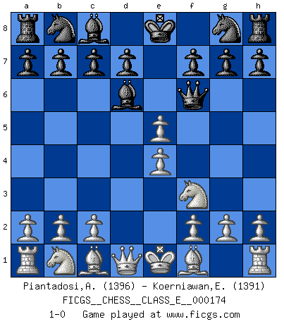Last move : 1-0 2014 September 28 8:32:36 [Event "FICGS__CHESS__CLASS_E__000174"] [Site "FICGS"] [Date "2014.08.15"] [Round "1"] [White "Piantadosi,Angelo"] [Black "Koerniawan,Eko"] [Result "1-0"] [WhiteElo "1396"] [BlackElo "1391"] 1.e4 e5 2.Nf3 Qf6 3.d4 Bd6 4.dxe5 1-0 This chess game has been lost on time (started : 2014.08.15 21:28:47) Greco defense Player White won this chess game. Follow this game move after move (download)If one piece is badly posted, the whole game is bad. (Tarrasch) Sie bekommen vielleicht den Eindruck, dass die Spitzenspieler überhaupt gar nicht so stark sind. Aber das stimmt nicht. Es ist eine Illusion. Mit einem Computer an der Seite ist es sehr leicht, Urteile zu fällen, aber wenn man alleine am Brett sitzt, sieht die Sache ganz anders aus. (Vladimir Kramnik) Bobby Fischer es el jugador de Ajedrez mas grande que jamás haya existido. (Ken Smith) Les échecs sont plus proches de l'art de l'assassinat que de l'art de la guerre. (Arturo Perez-Reverte) Life is pain my dear and anyone who says otherwise is selling something. (Princess Bride)