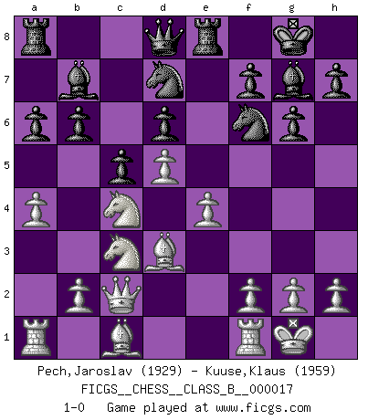 Last move : 1-0 2007 June 29 9:13:15 [Event "FICGS__CHESS__CLASS_B__000017"] [Site "FICGS"] [Date "2007.02.21"] [Round "1"] [White "Pech,Jaroslav"] [Black "Kuuse,Klaus"] [Result "1-0"] [WhiteElo "1929"] [BlackElo "1959"] 1.d4 Nf6 2.c4 c5 3.d5 e6 4.Nc3 exd5 5.cxd5 d6 6.Nf3 g6 7.e4 Bg7 8.Be2 O-O 9.O-O Re8 10.Nd2 a6 11.a4 b6 12.Qc2 Bb7 13.Bd3 Nbd7 14.Nc4 1-0 Benoni defense Kingside Castling by player Black (move 8) Kingside Castling by player White (move 9) Player White won this chess game. Follow this game move after move (download)Chess makes man wiser and clear-sighted. (Vladimir Putin) Es ist peinlich, dass ich nie Weltmeister wurde. Es wäre leicht, Leonid Breschnjew als Ursache vorzuschieben, dessen Apparat den Vorzeigekommunisten Anatoli Karpow in allem unterstützte. Aber Garri Kasparow zum Beispiel, der ebenfalls von den Sowjets unerwünscht war, hat trotz der Widerstände den WM-Titel erobert. (Viktor Kortschnoi) La última cosa en que Fischer estaba interesado era en tonterías, siempre y cuando el Ajedrez estuviera involucrado. (Elie Agur) La victoire dans une partie d'Echecs appartient la plupart du temps à celui qui voit un peu plus loin que l'adversaire. (Lasker) The only sure thing about luck is that it will change. (Wilson Mizner)