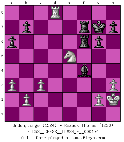 Last move : 0-1 2014 November 7 15:10:29 [Event "FICGS__CHESS__CLASS_E__000174"] [Site "FICGS"] [Date "2014.08.15"] [Round "1"] [White "Orden,Jorge"] [Black "Rezack,Thomas"] [Result "0-1"] [WhiteElo "1224"] [BlackElo "1220"] 1.e4 c5 2.Nf3 d6 3.d4 cxd4 4.Nxd4 Nf6 5.Nc3 a6 6.Be2 g6 7.O-O Bg7 8.Be3 O-O 9.f4 e5 10.fxe5 dxe5 11.Nf3 Nc6 12.Qxd8 Rxd8 13.Rfd1 Bd7 14.h3 Rac8 15.Bb6 Re8 16.a3 Be6 17.Ng5 Nd7 18.Nxe6 Nxb6 19.Nc5 Re7 20.Rd2 Nd4 21.Nb3 Nxe2+ 22.Nxe2 Rec7 23.c3 Bh6 24.Rd3 Nc4 25.Rb1 Bg5 26.Na1 Rc6 27.Nc2 Nd2 28.Rd1 Nxe4 29.Nb4 Rb6 30.Ng3 Nc5 31.Rd7 Nxd7 32.Rxd7 Re8 33.Ne4 Bc1 34.Nd6 Rf8 35.Nxf7 Rxf7 36.Rd8+ Kg7 37.Nd3 Be3+ 38.Kh2 Rbf6 39.Nxe5 Bf4+ 0-1 Sicilian : Najdorf, Opovcensky variation Kingside Castling by player White (move 7) Kingside Castling by player Black (move 8) Player Black won this chess game. Follow this game move after move (download)Half the variations which are calculated in a tournament game turn out to be completely superfluous. Unfortunately, no one knows in advance which half. (Jan Tinman) Modernes Schach erfordert enorme Anspannung. Es ist für einen normalen Menschen unmöglich das auszuhalten. (Viktor Kortschnoi) Algunos sacrificios son sólidos, los demás son míos. (Mikhail Tal) Je crois qu'il existe des manières très spécifiques de jouer efficacement contre une machine. Evidemment, nous n'avons aucune chance en technique pure, parce que l'ordinateur calcule de manière parfaite. Mais lorsque nous faisons appel à notre cerveau, en utilisant l'intuition et la compréhension, alors nous restons beaucoup plus forts. (Anatoli Karpov) He who laughs last probably does not get the joke. (Unknown)