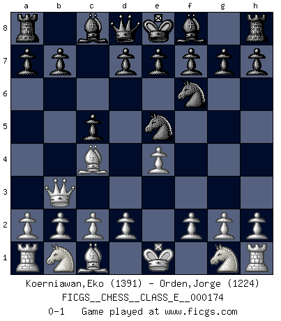 Last move : 0-1 2014 September 28 8:32:36 [Event "FICGS__CHESS__CLASS_E__000174"] [Site "FICGS"] [Date "2014.08.15"] [Round "1"] [White "Koerniawan,Eko"] [Black "Orden,Jorge"] [Result "0-1"] [WhiteElo "1391"] [BlackElo "1224"] 1.e4 c5 2.Qf3 Nc6 3.Bc4 Ne5 4.Qb3 Nf6 0-1 This chess game has been lost on time (started : 2014.08.15 21:28:47) Sicilian defense Player Black won this chess game. Follow this game move after move (download)Even the laziest King flees wildly in the face of a double check ! (Aaron Nimzowitsch) Oft bringt ein stiller Zug das Erdbeben. (Richard Reti) Todo se encuentra en un estado de flujo y esto incluye al mundo del Ajedrez. (Mikhail Botvinnik) Ce n'est pas pour s'amuser qu'il joue aux échecs : il célèbre un culte. (Vladimir Nabokov) It is not enough to be a good player... you must also play well. (Siegbert Tarrasch)